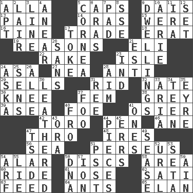 ACROSS 1. Silent film actress Nazimova 5. Smile enhancers 9. Raised platform 13. Ache 14. Mouths or openings 15. We are 16. Prong on a fork 17. Swap 18. Part of Q.E.F. 19. Thinks logically 21. Connecticut Ivy Leaguer 22. Libertine 23. Small island 24. White ___ sheet 27. Teachers' org. 28. Against 29. Exchanges for money 31. To free from 32. Nathan's nickname 36. Leg joint 37. Opposite of masc. 38. Jennifer or Joel 39. At sea 40. Enemy 41. Flexible twig of a willow tree 42. "Corrida" creature 44. Fenced enclosure 46. One (Scot) 47. Through, poetically 48. Angers 50. Ocean 51. Son of Zeus who helped slay Medusa 54. Having or resembling wings 56. Plates 58. Type of rug 60. Travel on or in a vehicle 61. Characteristic smell of wine 62. Suttee (variant) 63. Nourish 64. Pismires 65. Liveliness DOWN 1. Fitting 2. Den 3. Actor's bit 4. Approach 5. Pupil covering 6. Ancient river in northeast Turkey 7. Writing tablet 8. Compass dir. 9. Residences 10. Nest on high 11. Retirement account (abbr.) 12. Put into a specified state 17. Puff or smoke 20. Without 21. Eastern Standard Time (abbr.) 23. Working for oneself (abbr.) 24. "____ silly question..." 25. Elected reps. 26. Toward shelter 28. Direct toward a target or goal 30. Resembling or made to resemble leather 31. To riddle 33. Roberta Peters solo 34. Adolescent 35. Jane of fiction 37. Egg _ yung 40. From 41. Singles 43. Mouth or opening 44. Components 45. Blunders 47. Sadhe (variant) 49. Gospel singer Marvin 51. Inconspicuous attention getter 52. Mountain range 53. Stalk of a moss capsule 54. Sandy's bark 55. Falsehood 56. Heredity factor (abbr.) 57. Electrically charged atom 59. The 18th letter of the Arabic alphabet