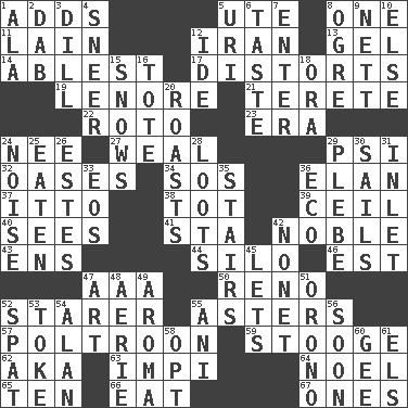 ACROSS 1. Does sums 5. Shoshoni 8. Single 11. (Had) reclined 12. SW Asia republic 13. Set 14. Most capable 17. What propaganda does 19. Poe poem 21. Cylindrical with tapered ends 22. Printing process, for short 23. Epoch 24. Born 27. Welt 29. Air pressure measure (abbr.) 32. Fertile tracts in a desert 34. Distress signal 36. Style 37. "Tell ____ the Marines!" 38. Small child 39. To provide with a ceiling 40. Observes 41. R.R. building 42. Impressive in appearance 43. Followers of ems 44. Grain storage tower 46. Eastern Standard Time (abbr.) 47. Auto club (abbr.) 50. Western Nevada city 52. A viewer who gazes fixedly 55. Michaelmas daisies 57. Characterized by complete cowardliness 59. Moe Howard, for one 62. Alias (abbr.) 63. Body of Kaffir warriors 64. Christmas carol 65. "___ Little Indians" 66. Ingest 67. Washington bills DOWN 1. Insect wing 2. Pat or tap gently 3. Deli pickle 4. Contemptuous expression 5. RI univ. 6. Clothes sense 7. Keyboard key 8. Legendary monster 9. Remaining after all deductions 10. Otherwise 12. Binary compound 15. Overwhelms 16. Lug 18. Mouth or opening 20. Cooks with dry heat, as in an oven 24. Annoying sound 25. Eroded 26. _____ Park, CO 28. Plunders 29. First-year military academy student 30. Travel by water 31. An arm off of a larger body of water 33. Greek goddess of the dawn 35. Flight of steps 36. Environmental prefix 42. Music written for nine 45. Allows 47. Tate display 48. Nest on high 49. Odor 51. U. of Maine site 52. Argument over a trivial matter 53. Puff or smoke 54. Actor Alda or Thicke 55. Black tropical American cuckoo 56. Within a short period 58. Elect 60. Turn to the right 61. Raised railways