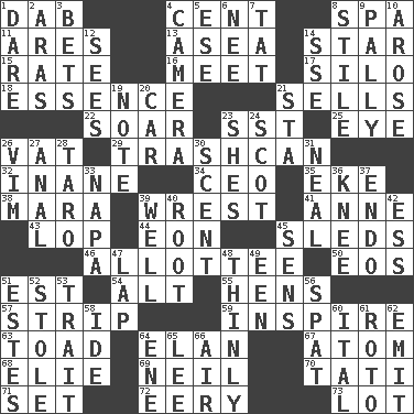 ACROSS 1. Small moist lump or mass 4. Penny 8. Health resort 11. Ancient Greek god of war 13. At sea 14. Play the lead 15. Assign a rank or rating to 16. Confront 17. Grain storage tower 18. Gist 21. Exchanges for money 22. Fly high 23. Fast jet (abbr.) 25. Sight organ 26. Large container 29. File 13 32. Lacking in sense or substance 34. Corporate head (abbr.) 35. Make supply last 38. Hindu Mythology: god of death 39. Obtain by seizing forcibly or violently 41. Singer Murray 43. Chop off 44. Period of immesurable duration 45. Bobsleighs 46. One to whom something is allotted 50. Greek goddess of the dawn 51. Eastern Standard Time (abbr.) 54. The first octave above the treble staff 55. Coop moms 57. Remove all contents or possession from 59. Motivate 63. Frog relative 64. Enthusiasm 67. Tiny particle 68. Writer Wiesel 69. Famous astronaut Armstrong 70. Jacques of French films 71. Put into a specified state 72. Suggestive of the supernatural 73. Car dealer's back yard DOWN 1. Have the gumption 2. Ancient river in northeast Turkey 3. Wagers 4. Device for capturing images 5. Compass dir. 6. Born 7. Make lace 8. Vertical member of a panel or frame 9. Friendly 10. Came up 12. Perceives with the eye 14. Compass dir. 19. Musical sound 20. Automobile 21. R.R. building 23. "______ My Girl" (Turtles hit) 24. Highlander 26. Zeal 27. Of or related to the anus 28. Pacific island yam 30. Aroma 31. Anneal 33. California wine valley 36. Leg joint 37. Inside; within (prefix) 39. Water source 40. Carrot, for example 42. Curvy letter 45. Elected reps. 47. Infant locale 48. Without viscosity 49. Car or cant ending 51. _____ Park, CO 52. Took without asking 53. Distinguishing feature 56. Petty quarrel 58. Binary compound 60. Slanted text style (abbr.) 61. Printing process, for short 62. Give off 64. Compass dir. 65. Area sheltered from the wind 66. Atmosphere