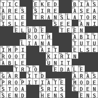 ACROSS 1. Nervous spasm 4. Made supply last 8. Prejudice 12. Ancient Greek god of war 14. Male parent of an animal 15. At sea 16. Ubangi River tributary 17. Interpreter 20. Capri or Wright 21. Perceive with the eye 22. Black tropical American cuckoo 23. Evade 27. Adolescent 29. Writer of Portnoy's Complaint (1969) 31. "This won't hurt ____!" 34. Climbing, woody, usually tropical vines 35. Ballerina skirt 36. Body of Kaffir warriors 39. Small island 41. Otherwise 42. Carrot, for example 43. Japanese brewing company 46. Competent 47. A single undivided whole 48. Musical group of three 51. Peak District village in England 54. Slender fish 56. It would 58. Ancient river in northeast Turkey 61. Appease 66. Method 67. Portico 68. Indian titles of respect 69. Paradise 70. Transmit 71. Coop moms 72. Followers of ems DOWN 1. "Change" in Tahitian 2. Angers 3. Cell (Danish) 4. Eastern Standard Time (abbr.) 5. Apertif with cassis 6. Period 7. Habitations of wild animals 8. Sound made by sheep 9. Byzantium, centuries later 10. Period of immesurable duration 11. Indian skirt 13. Sew up the eyelids of hawks and falcons 18. Arrange properly for use 19. Area sheltered from the wind 24. RI univ. 25. ___ good deed 26. Inactive volcano in Sicily 28. Ingested 30. Japanese poetic form 32. It is 33. Third day of the wk. 34. 61 cubic inches 36. Retirement account (abbr.) 37. Crowd into 38. Coward 40. Prong on a fork 44. To free from 45. Call ___ day 49. One more than two 50. Baseball player Mel 52. Unable to walk 53. Eat (away) 54. Global Positioning Systems (abbr.) 55. Johnson of "Laugh-In" 57. Food container 59. An important port of Yemen 60. Elected reps. 62. Groovy apt. 63. "We ___ not amused" (Victoria) 64. Shallow baking pan 65. Double-curved letter