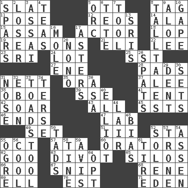 ACROSS 1. Narrow board 5. Baseball player Mel 8. Label 11. Introduce or present, as a question 12. Vintage cars 14. Chicken ___ king 15. Indian state 17. Thespian 18. Trim (branches) 19. Thinks logically 21. Connecticut Ivy Leaguer 22. Area sheltered from the wind 23. Indian title of respect (Mr.) 24. Car dealer's back yard 25. Fast jet (abbr.) 27. Compass dir. 28. Groovy apts. 31. Remaining after all deductions 35. Mouth or opening 37. Toward shelter 38. Mitch Miller's instrument 39. Compass dir. 41. Portable shelter 42. Fly high 43. Everything 45. Fast planes 46. Extremities 47. Experiment locale 49. Put into a specified state 51. One more than two 52. R.R. building 55. Sep. follower 57. _ moment's notice (2 wds.) 60. Speakers 62. Thick or sticky substance 63. A piece of turf (Scot.) 65. Grain storage towers 66. Friend of Pooh 67. Clip 68. French philosopher Descartes 69. Pipe bend 70. Eastern Standard Time (abbr.) 71. Locale of original sin DOWN 1. Practice fights 2. Failure 3. Slender Brazilian palm 4. Beverages made from leaves 5. The grampus (Milton) 6. Wig 7. Implement 8. Baron Munchausen's specialties 9. _ vera 10. Open wide 13. Indian titles of respect 16. Undercover agent 17. Michaelmas daisies 20. Words to Nanette 26. Arguments over trivial matters 29. Scratch 30. Puts into a specified state 31. Olfactory organ 32. Inky black, to poets 33. Inedible or poisonous agaric 34. Laconic 36. White ___ sheet 40. American author Paul (1891-1958) 44. Den 48. Prejudice 50. Small boys 52. Having a sole or soles 53. Heavy duty weighing machine 54. NE Netherlands city 55. Legendary monster 56. Calm and collected 58. Prong on a fork 59. Deliberation 61. Become fatigued 64. Choose