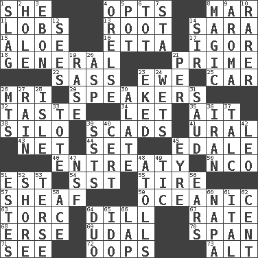 ACROSS 1. A female animal or person 4. Chooses 8. Third mo. 11. Tennis shots 13. Carrot, for example 14. "Two Mules for Sister ____" 15. Medicinal plant 16. Singer James 17. Russian composer Stravinsky 18. Commissioned military rank 21. A-one 22. Backtalk 23. She-sheep 25. Auto 26. Medical imaging device (abbr.) 29. Orators 32. Clothes sense 34. Allow 35. Small island 38. Grain storage tower 39. Loads 41. Mountain range 43. Fish or hair follower 44. Arrange properly for use 45. Peak District village in England 46. Plea 50. Non-commissioned officer (abbr.) 51. Eastern Standard Time (abbr.) 54. Fast jet (abbr.) 55. Become fatigued 57. To gather and bind into a bundle 59. Pertaining to the sea 63. Torque (variant) 64. Deli pickle 67. Assign a rank or rating to 68. Celtic language 69. Allodial 70. Connect, as a bridge 71. Perceive with the eye 72. I made a mistake 73. The first octave above the treble staff DOWN 1. Volcanic refuse 2. Hollow 3. Inky black, to poets 4. Threatening words 5. Cooking vessel 6. Small child 7. R.R. building 8. Mysterious quality of enchantment 9. Scent 10. More uncommon 12. Perceives with the eye 14. Title for a knight 19. To erase 20. Cleo's killer 21. For each 23. Supplemented with great effort 24. Moistens 26. Mountains (abbr.) 27. Precipitation 28. Small island 30. Having winglike extensions 31. Saudi Arabian king (1953-1964) 33. Carryall 36. SW Asia republic 37. Baby powder 39. Fast planes 40. Foregone conclusion 42. Lion 45. Jane of fiction 47. Overdraft (abbr.) 48. Ringlike coral islands and reefs 49. Nervous spasm 51. _____ Park, CO 52. Dinah or Pauly 53. Laconic 56. Hearing organs 58. Adept person 60. California wine valley 61. Slanted text style (abbr.) 62. Penny 64. Superhero pair 65. Wedding promise 66. Pet locale