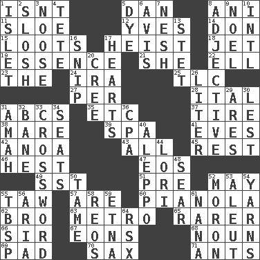 ACROSS 1. Is not 5. Daniel's nick name 8. Cuckoo 11. _ gin 12. Jacques Cousteau's middle name 14. Spanish title 15. Plunders 17. Robbery 18. _ stream 19. Gist 21. A female animal or person 22. Pipe bend 23. Definite Article 24. Lyricist Gershwin 25. Affectionate concern, for short 27. For each 28. Slanted text style (abbr.) 31. Lettered men learn these first 35. And so on (abbr.) 37. Become fatigued 38. Female horse 39. Health resort 41. Nights before holidays 42. Small Philippine buffalo 43. Everything 45. Respite 46. Behest 47. Greek goddess of the dawn 49. Fast jet (abbr.) 51. Before (prefix) 52. Fifth month 55. The 23rd letter of the Hebrew alphabet 57. "We ___ not amused" (Victoria) 60. Player piano 62. Sis' sibling 63. Paris' subway 65. More uncommon 66. Title for a knight 67. Immeasurably long periods of time 68. Part of speech 69. Writing tablet 70. Saxophone 71. Pismires DOWN 1. Small island 2. Agitate, as a liquid 3. Trap for birds or small mammals 4. False hair 5. Color 6. Deliberation 7. Tender 8. Descriptive word 9. Christmas carol 10. International (abbr.) 13. Proofreading order 16. Clip 17. Centers 20. Algonquian 26. 61 cubic inches 29. Ancient Greek god of war 30. For fear that 31. Wet nurse 32. Object of repulsion 33. What you're doing now 34. Theater features 36. Tax preparer (abbr.) 40. City in Syria 44. Australian parrot (variant) 48. Shrivel 50. Docile 52. Person of subnormal intelligence 53. Eskimo relative 54. Tall tales 55. Cook's measure (abbr.) 56. Operatic vocal solo 58. Vintage cars 59. Inactive volcano in Sicily 61. Grandmother 64. Acura sports coupe