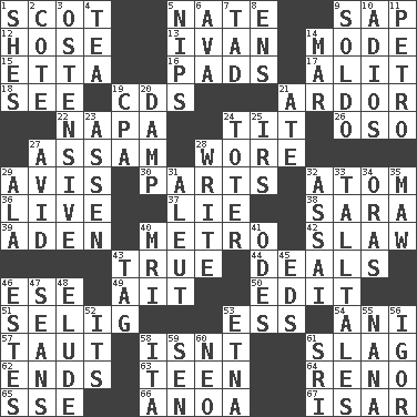 ACROSS 1. Native of Scotland 5. Nathan's nickname 9. Plant excrement 12. Stockings 13. "Terrible" tsar 14. Method 15. Singer James 16. Groovy apts. 17. Came down and settled, as after flight 18. Observe 19. Music discs 21. Zeal 22. California wine valley 24. Teat (slang) 26. Bear (Spanish) 27. Indian state 28. Had on 29. Deliberation 30. Components 32. Tiny particle 36. Not recorded 37. Whopper 38. "Two Mules for Sister ____" 39. An important port of Yemen 40. Paris' subway 42. Cole _ (cabbage dish) 43. Loyal 44. Allots cards 46. Compass dir. 49. Small island 50. Prepare for publication 51. Former Milwaukee Brewers owner Bud 53. Double-curved letter 54. Cuckoo 57. Tense 58. Is not 61. Volcanic refuse 62. Conclusions 63. Adolescent 64. Former U.S. Attorney General Janet 65. Compass dir. 66. Small Philippine buffalo 67. Austrian river, tributary to the Danube DOWN 1. "______ My Girl" (Turtles hit) 2. ____ d'Azur (French Riviera) 3. Clearly or manifestly demonstrative 4. Afternoon social gathering 5. Cuts off 6. Actress Gardner 7. Bit 8. Followers of ems 9. Twentieth part of a lira 10. Goodbye (Sp.) 11. Stone: prefix 14. Spoil 19. Accounting whiz (abbr.) 20. Moist 21. Had dinner 23. NE Netherlands city 24. Carrier 25. Big collection agency 27. Enthusiastic 28. Compose 29. Wing 31. Native American of Southwest Alaska 32. Slender Brazilian palm 33. Baron Munchausen's specialties 34. Mouths or openings 35. Informal term for the mouth 40. Medical imaging device (abbr.) 41. Lyric poems 43. Label 45. Begley and Asner 46. _____ Park, CO 47. Seines 48. Dodge 52. ___ a Wonderful Life 53. Inactive volcano in Sicily 55. Nanny 56. Russian composer Stravinsky 58. Call ___ day 59. Elected rep. 60. Modern: prefix 61. Indian title of respect (Mr.)
