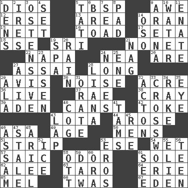 ACROSS 1. "Vaya con ____" 5. Cook's measure (abbr.) 9. Deep reverence 12. Celtic language 13. Length times width 14. NW Algerian seaport 15. Remaining after all deductions 16. Frog relative 17. Bristle 18. Compass dir. 19. Indian title of respect (Mr.) 21. Music written for nine 22. California wine valley 24. Teachers' org. 26. "We ___ not amused" (Victoria) 27. Slender Brazilian palm 28. Having great length 29. Opinion 30. Annoying sound 32. Measure of real estate 36. Not recorded 37. Actress Charlotte 38. Supercomputer manufacturer 39. Arabian gulf 40. 2nd pers. sing. pres. of can (arch.) 42. Casino tip 43. Globular water bottle used in Asia 44. Came up 46. White ___ sheet 49. Grow older 50. Not women's 51. Remove all contents or possession from 53. Compass dir. 54. Dripping 57. Ketch in the Levant 58. Scent 61. Flatfish 62. Toward shelter 63. Edible starchy tuberous root 64. 4th largest of the Great Lakes 65. Cartoonist voice _ Blanc 66. It was, poetically 67. Paradise DOWN 1. Lairs 2. Angers 3. Clearly or manifestly demonstrative 4. Put into a specified state 5. Jacques of French films 6. Sis' sibling 7. Ocean 8. Groovy apt. 9. Sports stadium 10. Wetness 11. Related on the mother's side 14. Bear (Spanish) 19. Health resort 20. Precipitation 21. Tired old horse 23. NE Netherlands city 24. Olfactory organs 25. Compass dir. 27. Enthusiastic 28. Climbing, woody, usually tropical vines 29. Wing 31. Speak pompously 32. 13-14th century defensive garment 33. What you're doing now 34. Immoral or dissolute person 35. Sight organ 40. Gear tooth 41. Scottish caps 43. Pet locale 45. To riddle 46. Indian state 47. Lacking originality or spontaneity 48. Satellite of Uranus 52. Frozen water 53. Greek god of love 55. Writer Wiesel 56. Adolescent 58. Baseball player Mel 59. Simpleton 60. Mouth or opening 61. Perceive with the eye