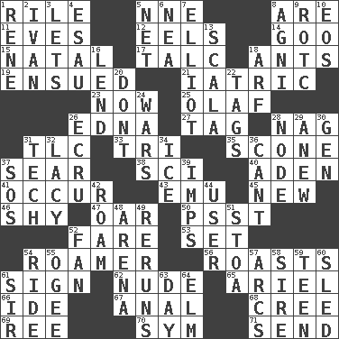 ACROSS 1. Cause heat under the collar 5. Compass dir. 8. "We ___ not amused" (Victoria) 11. Nights before holidays 12. Snakelike fish 14. Thick or sticky substance 15. Brizilian seaport 17. Baby powder 18. Pismires 19. Followed as a consequence or result 21. Of or pertaining to medicine 23. Immediately 25. Norwegian king 26. Pulitzer Prize-winning author Ferber 27. Label 28. Tired old horse 31. Affectionate concern, for short 33. Three (prefix) 35. Biscuitlike quick bread 37. Dry up 38. _-fi 40. An important port of Yemen 41. Come to pass 43. Australian flightless bird 45. ___ Haven, CT 46. Like a shrinking violet 47. Rowing implement 50. Inconspicuous attention getter 52. Conductor's collection 53. Put into a specified state 54. Nomad 56. Exposes to great heat 61. Public display of a written message 62. Naked 65. Satellite of Uranus 66. Binary compound 67. Of or related to the anus 68. Algonquian 69. Portuguese money of account (variant) 70. Symbol (abbr.) 71. Transmit DOWN 1. French philosopher Descartes 2. "Terrible" tsar 3. Allows 4. Son of Isaac 5. Fish or hair follower 6. Teachers' org. 7. American author Paul (1891-1958) 8. Hindu god of fire 9. College mil. group 10. Greek goddess of the dawn 13. Any of the three canals of the cochlea 16. Grant temporary use of 18. Sandy's bark 20. Do not 22. Labels 24. Armed conflicts 26. Shade of tan 28. Thickened enlargement 29. Afresh 30. Commissioned mil. rank 31. Technical 32. Made of lace 34. Frozen water 36. Patter 37. Distress signal 39. Naughty children 42. Wander aimlessly 44. One who makes use of a thing 48. Sports stadium 49. Summer TV shows 51. Portico 52. Avid follower 54. Travel on or in a vehicle 55. Double curve, resembling the letter S 57. Arches 58. The founder of a family 59. Adolescent 60. Downhill vehicle 61. Title for a knight 63. 24 hours 64. Shade tree