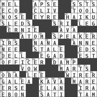 ACROSS 1. Cartoonist voice _ Blanc 4. Domed church section 8. Fast planes 12. Environmental prefix 13. 154 in Roman numerals 14. Instrument 15. Characteristic smell of wine 17. Jane of fiction 18. Japanese verse 19. Bobsleighs 21. Indian title of respect (Mr.) 23. Part of a journey 24. Bert's buddy 26. Actress Gardner 28. Smallest unit of an element 30. Orator 34. Big collection agency 37. Grandmother 39. Singer Murray 40. Born 41. Showing deterioration from age 43. Begley and Asner 44. Small valley 46. Mild oath 47. Eastern Standard Time (abbr.) 48. Person of authority 51. Moist 54. Promise 55. Shops 58. Chief or king in Benin or Nigeria 61. Area sheltered from the wind 63. One who wires 65. An organ shaped like a helmet 67. Polynesian shrub of the pepper family 71. Female horse 72. Celtic language 73. Enthusiasm 74. Lyricist Gershwin 75. Inky black, to poets 76. Suttee (variant) 77. Scottish cap DOWN 1. Not women's 2. Learning spot: Fr. 3. Failure 4. Adept person 5. Strand of rope, yarn or thread 6. Title for a knight 7. Nights before holidays 8. R.R. building 9. Land 10. Casino tip 11. Snaillike creature with no shell 16. Pulitzer Prize-winning author Ferber 18. Hub of activity 20. Be seated 22. Hit sharply and swiftly 25. Immeasurably long periods of time 27. American Automobile Association (abbr.) 29. Mother 30. First course 31. Leg joint 32. Conclusions 33. Repose 34. _ china 35. Coral ridge 36. Itself 38. Tired old horse 42. Dutch treat 45. 54 in ancient Rome 49. Root beer relative 50. She-sheep 52. Informal term for the mouth 53. Demure 56. Distinguishing feature 57. Father Junipero _ 58. Double curve, resembling the letter S 59. Sharp remark 60. In addition 62. Supplements with great effort 64. 480, 500 or 516 sheets of paper 66. Car or cant ending 68. In the manner of 69. Large container 70. Cuckoo