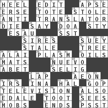 ACROSS 1. The bottom of a shoe or boot 5. Prepare for publication 9. Domed church section 13. Celtic language 14. Carry 15. Took without asking 16. Opposed to 17. Interpreter 19. Pass on 20. Declare 21. ___ good deed 22. Filthy place 23. He sold his birthright 25. Fast jet (abbr.) 26. Founders of families 30. Chop _ 34. Lacking originality or spontaneity 35. Woody plant 36. Jai ____ 39. Suffix with ecto or cyto 42. Lubricates 43. Floor protectors 44. New (sp.) 46. Collude with 47. Former Milwaukee Brewers owner Bud 48. Pet locale 51. A really long time 54. Big collection agency 57. _ tizzy (2 wds.) 58. Actor Linden 60. Grand Old Party 62. Boob tube 65. In addition 66. Peak District village in England 67. A blast of a horn 68. Observes 69. Disorderly crowds 70. Extremities 71. Inconspicuous attention getter DOWN 1. Froth on beer 2. Bert's buddy 3. _____ Park, CO 4. Flowery wreath 5. Singer James 6. Small, narrow, flatbottom fishing boat 7. Call ___ day 8. Is inclined (to) 9. "One Day ___ Time" 10. Plant holders 11. Position in a hierarchy or organization 12. Suggestive of the supernatural 15. Narrow board 18. Mayday 20. Set or collection 24. Help 27. Reproach for some lapse or misdeed 28. Pipe bend 29. Actors Connery and Penn 30. Moe Howard, for one 31. RI univ. 32. Snakelike fish 33. Consenting reply 36. Nursemaid (var.) 37. Experiment locale 38. Had dinner 40. Take to court 41. Cartoonist voice _ Blanc 45. Small bottle 48. Not recorded 49. Cuckoo 50. Thick mixture 52. Stares at amorously 53. Olfactory organs 54. A whole individual unit 55. Do over again 56. Broad, flat, thick piece 58. Parka part 59. Pismires 61. Mail 63. Raised railways 64. Electrically charged atom 65. Viper