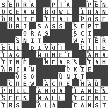 ACROSS 1. Father Junipero _ 6. Parent Teacher Assoc. 9. Fenced enclosure 12. Sea 13. Soup holder 14. SW Asia republic 15. Speak pompously 16. Slanted text style (abbr.) 17. Airs 18. RI univ. 19. Backtalk 20. Back-to-school mo. 21. Mouths or openings 23. _-fi 24. In a ____ (agitated or irritated) 25. Wetness 28. Connecticut Ivy Leaguer 30. A piece of turf (Scot.) 34. Quote 35. Label 36. Music written for nine 38. Santa ___, CA 39. Prong on a fork 41. Puts on (as clothing) 43. Scottish cap 44. Believer in; advocate of (suffix) 46. Migrant worker of the '30s 48. Bear (Spanish) 49. A single undivided whole 50. Ship's personnel 51. 1/640 square mile 53. Possessed 56. Silvers or Donahue 57. Small Philippine buffalo 58. Softens 60. Observes 61. Shopping center 62. Ancient Celtic tribe of eastern Britain 63. Big collection agency 64. Insect wing 65. 2nd pers. sing. pres. of can (arch.) DOWN 1. "Barney Miller" actor Jack 2. Shade of tan 3. Rump 4. Food allowance for one day 5. A saturated hydrocarbon 6. Plant holders 7. It was, poetically 8. Everything 9. Conciliate 10. Compass direction 11. Compass dir. 13. Prejudice 14. Medicinal drug used to evoke vomiting 19. Smooth fabric 20. Compass dir. 22. To free from 24. Seigniories (variant) 26. Inactive volcano in Sicily 27. 480, 500 or 516 sheets of paper 28. Singer James 29. Den 31. Solemn pledge 32. Single 33. Beverage made from leaves 37. Heavy duty weighing machine 40. Artist's stands 42. What Jean-Claude Killy likes to do 45. At this time 47. New York city 49. Mountain range 50. "Mermaids" star 51. Of or related to the anus 52. Root beer relative 54. So be it 55. Hiding places for outlaws 56. Air pressure measure (abbr.) 57. Nanny (var.) 58. Nervous spasm 59. Be seated