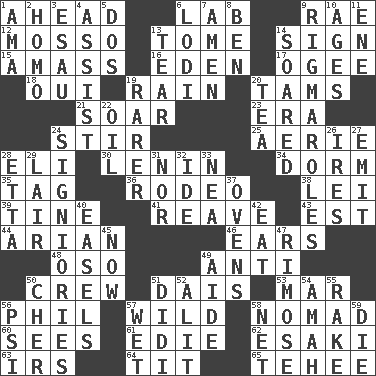 ACROSS 1. At or in the front 6. Experiment locale 9. Actress Charlotte 12. With motion or animation 13. Heavy book 14. Attach a signature 15. Collect or gather 16. Paradise 17. Double curve, resembling the letter S 18. Fr. "Yes" 19. Precipitation 20. Scottish caps 21. Fly high 23. Epoch 24. Move through with a circular motion 25. Nest on high 28. Connecticut Ivy Leaguer 30. Soviet premier 1918-24 34. Dormintory (informal) 35. Label 36. Cowboy competition 38. Luau accessory 39. Prong on a fork 41. Rob, plunder, or pillage 43. Eastern Standard Time (abbr.) 44. Believer in; advocate of (suffix) 46. Hearing organs 48. Bear (Spanish) 49. Against 50. Group working together 51. Raised platform 53. Spoil 56. Silvers or Donahue 57. Rampant 58. Roamer 60. Perceives with the eye 61. Singer Brickell 62. 1973 Nobel Price Winner (Physics) Leo 63. Big collection agency 64. Teat (slang) 65. Giggle DOWN 1. Wet nurse (var.) 2. Same (prefix) 3. He sold his birthright 4. Help 5. Two (Sp.) 6. Farming town in central California 7. So be it 8. Benjamin's nick name 9. Complicated, petty procedures 10. Ripens 11. Compass dir. 13. Separate forcefully 14. Flew 19. Less widely known 20. Afternoon social gathering 22. Lubricate 24. Seigniories (variant) 26. Angers 27. Give off 28. Singer James 29. Den 31. Or not 32. Binary compound 33. Teachers' org. 37. Baking chambers 40. Artist's stands 42. Erode 45. Immediately 47. Full of chinks, cracks, or crevices 49. Assistant 50. "Mermaids" star 51. "You Light Up My Life" star Conn 52. Came down and settled, as after flight 54. Nanny 55. Libertine 56. Air pressure measure (abbr.) 57. Dripping 58. Fish or hair follower 59. Expire