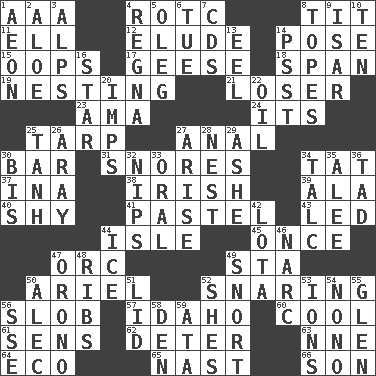 ACROSS 1. American Automobile Association (abbr.) 4. College mil. group 8. Teat (slang) 11. Pipe bend 12. Evade 14. Introduce or present, as a question 15. I made a mistake 17. Honkers 18. Connect, as a bridge 19. Inhabiting a nest 21. Failure 23. Housemaid (var.) 24. ___ a Wonderful Life 25. Canvas cover 27. Of or related to the anus 30. Oblong piece of solid material 31. Sounds asleep 34. Make lace 37. _ tizzy (2 wds.) 38. From or relating to Ireland 39. In the manner of 40. Like a shrinking violet 41. Soft color 43. Directed 44. Capri or Wright 45. Single time 47. The grampus (Milton) 49. R.R. building 50. Satellite of Uranus 52. Catching in a trap 56. Oscar Madison type 57. Potato state 60. Calm and collected 61. Elected reps. 62. Prevent from occurring 63. Compass dir. 64. Environmental prefix 65. Political cartoonist Thomas 66. Boy, to dad DOWN 1. Period of immesurable duration 2. Medicinal plant 3. High mountains 4. Canadian anthropologist Darnell 5. Cassini of fashion 6. Third day of the wk. 7. Music discs 8. Drinks excessively 9. Austrian river, tributary to the Danube 10. Nine, plus one 13. Snakelike fish 14. Inconspicuous attention getter 16. Play the lead 20. Naughty children 22. Petroleum 25. Hyperbolic tangent 26. Like ___ of sunshine 27. Ascend 28. Egg locale 29. American tennis player Robert 30. Twice 32. Pinches, bites 33. Relating to the mouth 34. Baby powder 35. Toward shelter 36. Small amount or degree 42. Globular water bottle used in Asia 44. Frozen water 46. Drug cop 47. U. of Maine site 48. Teases 49. Derisive sound 50. Actor Baldwin 51. Flaplike covering 52. "______ My Girl" (Turtles hit) 53. Charged particles 54. Words to Nanette 55. Small, secluded valley 56. Compass dir. 58. Lair 59. "One Day ___ Time"