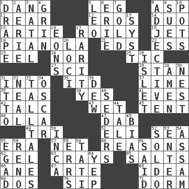 ACROSS 1. Mild oath, euphamism for damn 5. Part of a journey 8. Cleo's killer 11. Stern 12. Greek god of love 14. Superhero pair 15. Nick name for Arthur 17. Agitated, as a liquid 18. Passenger plane 19. Player piano 21. Begley and Asner 22. Double-curved letter 23. Snakelike fish 24. Not either 25. Nervous spasm 27. _-fi 28. Comedian Laurel of Laurel & Hardy 31. To the inside or interior of 35. It would 37. Welles in "The Third Man" 38. Afternoon social gatherings 39. Consenting reply 41. Nights before holidays 42. Baby powder 43. Soggy 45. Portable shelter 46. Rounded earthenware pot or jar 47. Pat or tap gently 49. Three (prefix) 51. Biblical high priest 52. Ocean 55. Epoch 57. Fish or hair follower 60. Thinks logically 62. Set 63. Trading vessels 65. Table seasonings 66. A saturated hydrocarbon 67. Johnson of "Laugh-In" 68. The main thing one is thinking about 69. Two (Sp.) 70. Small drink 71. Dormintory (informal) DOWN 1. Window treatment 2. Nest on high 3. Brizilian seaport 4. Amused look 5. Lion 6. 4th largest of the Great Lakes 7. Gilded 8. Descriptive word 9. Institutes legal proceedings 10. Plant holders 13. System (abbr.) 16. Immeasurably long periods of time 17. Noteworthy scarcity 20. Locales 26. Small island 29. So be it 30. A home for chicks 31. "Tell ____ the Marines!" 32. Be tempered by heat 33. Baron Munchausen's specialties 34. Witty Wilde 36. Morning condensation 40. Spring feasts 44. Falsehood 48. Prejudice 50. South American Indian 52. Twentieth part of a lira 53. Keyboard key 54. Indian state 55. Mild oath 56. Western Nevada city 58. Blunders 59. Jacques of French films 61. Stated 64. Slangy assent