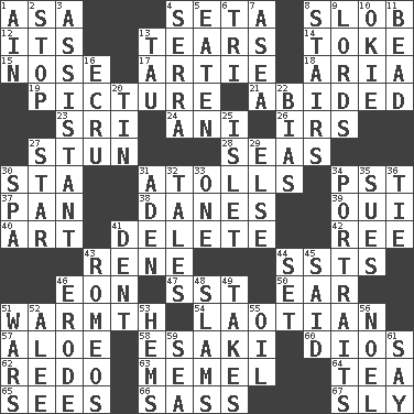 ACROSS 1. White ___ sheet 4. Stalk of a moss capsule 8. Messy guy 12. ___ a Wonderful Life 13. Pulls into pieces 14. Casino tip 15. Sense of smell 17. Nick name for Arthur 18. Roberta Peters solo 19. Photo 21. Tolerated 23. _ Lanka 24. Black tropical American cuckoo 26. Big collection agency 27. Surprise greatly 28. Oceans 30. R.R. building 31. Ringlike coral islands and reefs 34. Pacific Standard Time (abbr.) 37. Baking dish 38. Natives or inhabitants of Denmark 39. Fr. "Yes" 40. Nonscientific branch of learning 41. Erase 42. To sift 43. French philosopher Descartes 44. Fast planes 46. Age 47. Fast jet (abbr.) 50. Ewer handle 51. Heat 54. Of or relating to Laos or its people 57. Medicinal plant 58. 1973 Nobel Price Winner (Physics) Leo 60. "Vaya con ____" 62. Redecorate 63. Klaipeda city 64. Beverage made from leaves 65. Perceives with the eye 66. Backtalk 67. Roguish DOWN 1. The 18th letter of the Arabic alphabet 2. Obstruct or block passage 3. Aide 4. Father Junipero _ 5. Consumed 6. Three (prefix) 7. Toward the sea 8. Flight of steps 9. Domineers 10. Migrant worker of the '30s 11. Necklace unit 13. The 19th letter of the Greek alphabet 16. Shade of tan 20. Shallow baking pan 22. Prejudice 25. Small island 27. Play the lead 29. Otherwise 30. Health resort 31. An important port of Yemen 32. Stories 33. Single 34. Likenesses of persons 35. Takes to court 36. Neckwear 41. Incision 43. Lover boys 44. Put into a specified state 45. Stated 46. Eat (away) 48. Shuts with force 49. Receives possession of 51. Armed conflicts 52. Toward shelter 53. Cloth borders 55. Lubricate 56. Christmas carol 59. Ocean 61. Declare
