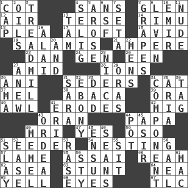 ACROSS 1. Small bed 4. Without 8. Small, secluded valley 12. Wind 13. Laconic 14. Tall New Zealand timber tree 15. Entreaty 17. High up in or into the air 18. Enthusiastic 19. Deli grouping 21. Electrical Unit 23. One of the 12 tribes of Israel 24. Commissioned mil. rank 26. Car or cant ending 27. Among 28. Charged particles 30. Black tropical American cuckoo 31. Spring feasts 34. Domesticated feline 37. Cartoonist voice _ Blanc 38. Phillipine bananalike plant 39. Mouth or opening 40. Leather borer 41. Eats (away) 42. Russian fighter aircraft 43. Northwest Algerian city 44. Dad 46. Medical imaging device (abbr.) 47. Affirmative reply 50. Bear (Spanish) 51. Sowing specialist 54. Nestling 57. Unable to walk 58. Slender Brazilian palm 60. 480, 500 or 516 sheets of paper 62. Toward the sea 63. Check the growth or development of 64. Teachers' org. 65. Shout 66. Snake ____ (dice throw) 67. Affectionate concern, for short DOWN 1. Head covering 2. Lubricates 3. Excercise machine 4. Major League Baseball Commissioner Bud 5. Came up 6. Science/research agcy. 7. Bristle 8. Raisin fruits 9. Make or become more lively 10. Independent ruler or chieftain 11. Unadorned 13. Scottish cap 16. Jai ____ 20. Plus 22. Not women's 25. Sibling's daughter 27. Afresh 29. Mouths or openings 30. Nursemaid (var.) 31. "Two Mules for Sister ____" 32. Black 33. June honoree 34. Piece 35. Roberta Peters solo 36. Label 41. One of the Great Lakes 43. Severe or trying experience 44. Plant holder 45. SW Saudi Arabia district 46. Klaipeda city 48. Take place subsequently 49. Actors Connery and Penn 51. Kill 52. Relaxation 53. Raze (variant) 55. Be seated 56. Highlander 59. Filthy place 61. Apple computer (short form)