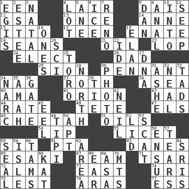 ACROSS 1. Car or cant ending 4. Den 8. Raised platform 12. Girls' org. (abbr.) 13. Single time 14. Queen of England 1702-14 15. "Tell ____ the Marines!" 17. Adolescent 18. Related on the mother's side 19. Seines 21. Lubricate 23. Trim (branches) 24. Voters do this 26. Male parent 28. The Jewish people; Israel 30. Pre-World Series prize 34. Tired old horse 37. Writer of Portnoy's Complaint (1969) 39. Toward the sea 40. Nanny (var.) 41. Constellation of myth 43. Possessed 44. Assign a rank or rating to 46. Wig 47. Raised railways 48. Leopard's kin 51. Lubricates 54. Mouth edge 55. It is permitted: Lat. 58. Be seated 61. Parent Teacher Association (abbr.) 63. Natives or inhabitants of Denmark 65. 1973 Nobel Price Winner (Physics) Leo 67. 480, 500 or 516 sheets of paper 71. Russian ruler of old 72. _ mater 73. Compass direction 74. RI univ. 75. For fear that 76. Caspian sea tributary 77. Curvy letter DOWN 1. Armor plate that protects the chest 2. First name in cosmetics 3. Relating to or accompanying birth 4. Car dealer's back yard 5. One (Scot) 6. Frozen water 7. Former U.S. Attorney General Janet 8. Daniel's nick name 9. Of or related to the anus 10. To the inside or interior of 11. Ooze 16. Washington bills 18. Liveliness 20. _-fi 22. Binary compound 25. "Corrida" creature 27. Heredity factor (abbr.) 29. Compass direction 30. Picture 31. American tennis player Robert 32. Anneal 33. Bits 34. Drug cop 35. Nanny 36. Yard entry 38. Make a knot 42. Famous astronaut Armstrong 45. Snakelike fish 49. Native american tent (variation) 50. Fitting 52. Hat (slang) 53. Go away! 56. Follow as a consequence or result 57. Rends 58. Lick closed 59. Capri or Wright 60. Scottish caps 62. Type of rug 64. Indian titles of respect 66. Krazy ___ of comics 68. Hearing organ 69. White ___ sheet 70. Mountains (abbr.)