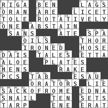 ACROSS 1. Port city in Latvia 5. Benjamin's nick name 8. Fails to keep up a pace 12. NW Algerian seaport 13. "We ___ not amused" (Victoria) 14. It is permitted: Lat. 15. Lacquered or enameled metalware 16. Rotating or pertaining to rotation 19. Single 20. Choose not to consume 21. Without 23. Had dinner 24. Health resort 27. Petroleums 30. Son of Odin 31. Pressed 34. Stockings 35. Raised platform 38. Falsehoods 40. Singer James 41. _ vera 42. Food holders 44. Not women's 45. Immoral or dissolute person 46. Personal Computers (abbr.) 47. Keyboard key 50. He sold his birthright 53. Speakers 57. Whopper 59. Italian handbag shop? 63. Pulitzer Prize-winning author Ferber 64. Slow-paced one 65. "___ Little Indians" 66. Puts into a specified state 67. Canvas cover 68. Compass dir. 69. Part of Q.E.F. DOWN 1. Printing process, for short 2. Metal shackles 3. An organ shaped like a helmet 4. One (Scot) 5. Sharp remark 6. Greek god of love 7. Remaining after all deductions 8. 54 in ancient Rome 9. Adept person 10. Set 11. Filthy place 14. Actor's bit 17. American Automobile Association (abbr.) 18. Teat (slang) 20. SW Saudi Arabia district 22. Annoying sounds 24. Opportunity 25. Mail 26. Length times width 28. Car dealer's back yard 29. Fastener 30. College papers 32. Pipe bend 33. Letter starter 35. Moist 36. Actor Baldwin 37. Charged particles 39. R.R. building 43. Supplements with great effort 47. Implement 48. Sandy's bark 49. Oblong piece of solid material 51. Tree or shrub in the Birch family 52. National forest in Provo, Utah 54. Carryall 55. Sign of something about to happen 56. French philosopher Descartes 58. Compass direction 59. Fast jet (abbr.) 60. Santa ___, CA 61. Auto 62. Monetary unit of Laos 63. Compass dir.