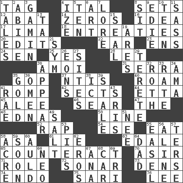 ACROSS 1. Label 4. Slanted text style (abbr.) 8. Puts into a specified state 12. Blind as ____ 14. Nothings 16. The content of cognition 17. Pale green bean 18. Pleas 20. Proofreads 22. Hearing organ 23. Followers of ems 24. Elected rep. 25. Affirmative reply 28. Allow 30. Mine, in Marseilles 31. Father Junipero _ 35. Grand Old Party 37. Nuclear Threat Initiatives 40. Wander 41. Play 42. Religious groups 44. Singer James 45. Toward shelter 46. Singe 47. Definite Article 48. Ferber et al. 50. Actor's bit 52. Strike 54. Compass dir. 55. Erode 58. White ___ sheet 61. Falsehood 63. Peak District village in England 65. Act in opposition 70. SW Saudi Arabia district 71. Hero or heavy, e.g. 72. Underwater navigation system 73. Lairs 74. Inside; within (prefix) 75. Indian skirt 76. Area sheltered from the wind DOWN 1. Stories 2. Tolerate 3. Homeless child 4. Ending with capital 5. "___ Little Indians" 6. Tate display 7. Old wives' tales, e.g. 8. Be seated 9. Singer Brickell 10. Adolescent 11. Backtalk 13. Make lace 15. Lick closed 19. Ancient Greek god of war 21. Symbol (abbr.) 26. Immeasurably long periods of time 27. Settings 29. Cylindrical with tapered ends 30. Seem 32. Writer of Portnoy's Complaint (1969) 33. Assign a rank or rating to 34. Wet nurse (var.) 35. Precious metal 36. Sign of things to come 38. Frozen water 39. Having lost freshness 41. Actress Charlotte 43. Indian titles of respect 49. Table seasoning 51. Born 53. Sliced desserts 55. Artist's stand 56. Place in a line 57. Laconic 58. 43,560 square feet 59. Within a short period 60. Old (Scot.) 62. Greek god of love 64. Male parent 66. Modern: prefix 67. Santa ___, CA 68. 4-wheeled motor vehicle 69. Three (prefix)