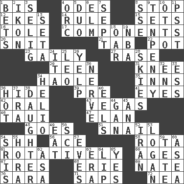 ACROSS 1. Again 4. Lyric poems 8. Halt 12. Makes supply last 14. General guideline 15. Puts into a specified state 16. Lacquered or enameled metalware 17. Parts 20. In a ____ (agitated or irritated) 21. Keyboard key 22. Cooking vessel 23. Lightheartedly 27. Raze (variant) 29. Adolescent 31. Leg joint 34. White Person, in Hawaii 35. Taverns 36. Flintstone garb 39. Before (prefix) 41. Snake ____ (dice throw) 42. Spoken 43. Viva Las _ 46. "Change" in Tahitian 47. Style 48. Leaves 51. Slow-paced one 54. Quiet! 56. Adept person 58. Round or rotation of duties 61. Producing rotation 66. Eons 67. Angers 68. 4th largest of the Great Lakes 69. Nathan's nickname 70. "Two Mules for Sister ____" 71. Plant excrements 72. Teachers' org. DOWN 1. Stakes 2. Visual representation of an object 3. Major League Baseball Commissioner Bud 4. The grampus (Milton) 5. Superhero pair 6. Shade tree 7. Back-to-school mo. 8. Compass dir. 9. 3-inch nail 10. Von Bismarck 11. Inconspicuous attention getter 13. Stalk of a moss capsule 18. Rowing implement 19. Basketball assoc. 24. Call ___ day 25. Lion 26. Sharp bark 28. Atmospheres 30. Boldness 32. Compass dir. 33. Curvy letter 34. Sun: prefix 36. Being at a high temperature 37. Retirement account (abbr.) 38. Female child 40. Snakelike fish 44. Separate the seeds from cotton 45. Santa ___, CA 49. Ingest 50. _-fi 52. SW Asia republic 53. Utah city north of Ogden 54. Indian titles of respect 55. Israeli folk dance 57. Nights before holidays 59. False hair 60. Toward the sea 62. White ___ sheet 63. Period 64. Mouth edge 65. Consenting reply
