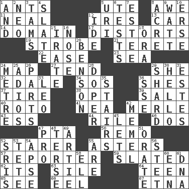 ACROSS 1. Pismires 5. Shoshoni 8. Deep reverence 11. Anneal 12. Angers 13. 4-wheeled motor vehicle 14. Realm 17. What propaganda does 19. Disco prop 21. Cylindrical with tapered ends 22. Comfort 23. Ocean 24. Atlas unit 27. Look after 29. A female animal or person 32. Peak District village in England 34. Distress signal 36. "______ My Girl" (Turtles hit) 37. Hoop that covers a wheel 38. Elect 39. Table seasoning 40. Printing process, for short 41. Teachers' org. 42. Haggard of country music 43. Curvy letter 44. Cause heat under the collar 46. Two (Sp.) 47. Parent Teacher Assoc. 50. San ____ (Riviera town) 52. A viewer who gazes fixedly 55. Michaelmas daisies 57. News announcer 59. Scheduled 62. It is 63. Filth; sediment 64. Adolescent 65. Observe 66. Snakelike fish 67. Inactive volcano in Sicily DOWN 1. Plus 2. Modern: prefix 3. Scottish caps 4. Schedule 5. RI univ. 6. Trials 7. First name in cosmetics 8. Land measure 9. Electrical Unit 10. Celtic language 12. Binary compound 15. Feeling or showing extreme anger 16. Characteristic smell of wine 18. Mouth or opening 20. Gillaume's butler role 24. Distance measurement (Brit.) 25. Goodbye (Sp.) 26. Actors' quests 28. Drug addict 29. Broken piece 30. Phone greeting 31. _____ Park, CO 33. Lion 35. Flight of steps 36. Compass dir. 42. Klaipeda city 45. Allows 47. Adept person 48. Laconic 49. Nick name for Arthur 51. Declaim 52. Indian titles of respect 53. Wig 54. Domed church section 55. "We ___ not amused" (Victoria) 56. Proofreading order 58. Pipe bend 60. Car or cant ending 61. Heredity factor (abbr.)