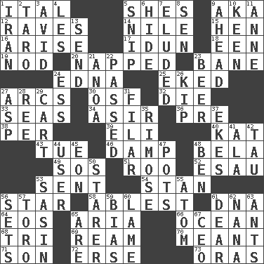 ACROSS 1. Slanted text style (abbr.) 5. "______ My Girl" (Turtles hit) 9. Alias (abbr.) 12. All-night dance parties 14. The longest river in the world 15. Layer 16. Originate 17. Goddess of spring and wife of Bragi 18. Car or cant ending 19. Allow head to fall sleepily 20. Slept 23. Object of repulsion 24. Pulitzer Prize-winning author Ferber 25. Supplemented with great effort 27. Arches 30. Order of Saint Francis (abbr.) 32. Expire 33. Oceans 34. SW Saudi Arabia district 36. Before (prefix) 38. For each 39. Connecticut Ivy Leaguer 40. Krazy ___ of comics 43. Third day of the wk. 46. Moist 48. Actor Lugosi 49. Mayday 51. Friend of Pooh 52. He sold his birthright 53. Posted 54. Comedian Laurel of Laurel & Hardy 56. Play the lead 58. Most capable 61. Heredity factor (abbr.) 64. Greek goddess of the dawn 65. Roberta Peters solo 66. Sea 68. Three (prefix) 69. 480, 500 or 516 sheets of paper 70. Intended 71. Boy, to dad 72. Celtic language 73. Mouths or openings DOWN 1. SW Asia republic 2. Pacific island yam 3. Enthusiastic 4. French article 5. Clip 6. Flintstone garb 7. Dodged 8. Elected rep. 9. At or in the front 10. Peachy ____! 11. Queen of England 1702-14 13. Transmit 21. Small Philippine buffalo 22. Went by 23. Fermented drink made from hops 24. Double-curved letter 26. Monetary unit of Laos 27. Viper 28. To riddle 29. Draw slowly or heavily 31. Having threads 35. Full of chinks, cracks, or crevices 37. Makes supply last 41. Wing 42. The 19th letter of the Greek alphabet 44. One who uses or employs something 45. Period of immesurable duration 47. Cooking vessels 48. Benjamin's nick name 50. A viewer who gazes fixedly 53. Indian antelope 55. Smallest unit of an element 56. Puts into a specified state 57. "Corrida" creature 59. Prejudice 60. Unable to walk 61. Letter starter 62. Nanny 63. Pismires 65. "We ___ not amused" (Victoria) 67. Corporate head (abbr.)