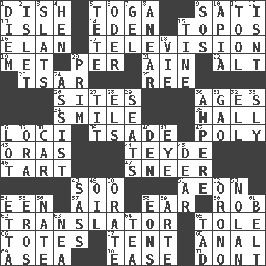 ACROSS 1. Food container 5. Ancient Roman robe 9. Suttee (variant) 13. Capri or Wright 14. Paradise 15. Literary convention 16. Style 17. Boob tube 19. Was introduced to 20. For each 21. The 18th letter of the Arabic alphabet 22. Keyboard modifier key 23. Russian ruler of old 25. Portuguese money of account (variant) 26. Locates 30. Eons 34. Grin 35. Promenade 36. Locales 39. Sadhe (variant) 42. More than one (prefix) 43. Mouths or openings 44. Miss Universe 1986, Barbara Palacios _ 46. Small pie 47. Scornful expression 48. "Barney Miller" actor Jack 51. Age 54. Car or cant ending 57. Atmosphere 58. Ewer handle 60. Director Reiner 62. Interpreter 65. Lacquered or enameled metalware 66. Lugs 67. Portable shelter 68. Of or related to the anus 69. At sea 70. Relaxation 71. Do not DOWN 1. South Vietnam president (1954) 2. Small island 3. Narrow boards 4. Layer 5. Wig 6. River in Europe 7. Set 8. Approach 9. Distress signal 10. Capital of Western Samoa 11. Instrument 12. Is not 15. Prong on a fork 18. Compete 20. Demure 24. Aid 27. Teat (slang) 28. Raised railways 29. Theater features 30. Electrical Unit 31. E Mali city 32. Pipe bend 33. Secret 36. Car dealer's back yard 37. Mouth or opening 38. 4-wheeled motor vehicle 40. Lair 41. Sight organ 45. Letter starter 48. Backtalk 49. Lubricate 50. Speak pompously 52. U. of Maine site 53. Pitcher Ryan 54. Singer James 55. Greek god of love 56. Nathan's nickname 58. Immeasurably long periods of time 59. Johnson of "Laugh-In" 61. Waist strap 63. Teachers' org. 64. Afternoon social gathering 65. Small boy