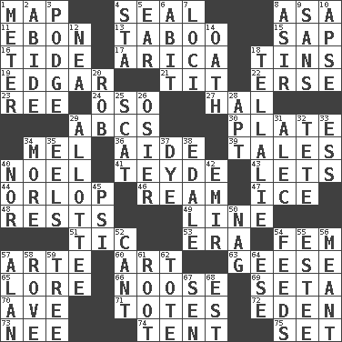 ACROSS 1. Atlas unit 4. Lick closed 8. White ___ sheet 11. Inky black, to poets 13. Off limits 15. Plant excrement 16. Periodic rise and fall of the sea level 17. N. Chile seaport 18. Metal containers 19. _ Allan Poe 21. Teat (slang) 22. Celtic language 23. To riddle 24. Bear (Spanish) 27. Actor Linden 29. Lettered men learn these first 30. Food holder 34. Cartoonist voice _ Blanc 36. Assistant 39. Falsehoods 40. Christmas carol 41. Miss Universe 1986, Barbara Palacios _ 43. Allows 44. Lowest deck of a ship 46. 480, 500 or 516 sheets of paper 47. Frozen water 48. Musical pauses 49. Actor's bit 51. Nervous spasm 53. Period 54. Opposite of masc. 57. Johnson of "Laugh-In" 60. Nonscientific branch of learning 63. Honkers 65. Old wives' tales, e.g. 66. Trap for birds or small mammals 69. Stalk of a moss capsule 70. "___ Maria" 71. Lugs 72. Paradise 73. Born 74. Portable shelter 75. Put into a specified state DOWN 1. Distance measurement 2. Remain 3. Puddle 4. R.R. building 5. Hearing organ 6. "This won't hurt ____!" 7. Event scenes 8. SW Saudi Arabia district 9. Without 10. Domed church section 12. Teachers' org. 14. Pledge 18. Copy Pinocchio 20. Director Reiner 25. Scram, to a cat 26. Flexible twig of a willow tree 28. Fitting 29. One to whom something is allotted 31. Actor Baldwin 32. Wig 33. Curvy letter 34. Greater amount 35. Snakelike fish 37. Color 38. Peak District village in England 40. And not 42. Independent ruler or chieftain 45. 23rd letter of the Greek alphabet 50. Tired old horse 52. Patter 54. Eats 55. First name in cosmetics 56. Intended 57. Actor Alda or Thicke 58. Be footloose 59. Relationship diagram 61. Carrot, for example 62. Lug 64. Compass dir. 67. Elected rep. 68. Eastern Standard Time (abbr.)