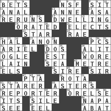 ACROSS 1. Wagers 5. Science/research agcy. 8. Be seated 11. Of or related to the anus 12. Queen of England 1702-14 13. White ___ sheet 14. Summer TV shows 17. Home 19. Spoke pompously 21. Chooses 22. Play the lead 23. Actress Charlotte 24. Actor Linden 27. At once, immediately (arch.) 29. Personal Computers (abbr.) 32. Satellite of Uranus 34. Two (Sp.) 36. Set down 37. Stare 38. Eastern Standard Time (abbr.) 39. Had on 40. (Had) reclined 41. Ocean 42. Distance measurement (Brit.) 43. Raised railways 44. Beget 46. Title for a knight 47. Parent Teacher Association (abbr.) 50. Round or rotation of duties 52. A viewer who gazes fixedly 55. Michaelmas daisies 57. News announcer 59. Threatening words 62. ___ a Wonderful Life 63. Drop; flow; fall 64. California wine valley 65. Perceive with the eye 66. Snakelike fish 67. Blind as ____ DOWN 1. Long, evenly shaped piece 2. Compass dir. 3. Pacific island yam 4. Plays smoothly or legato 5. Compass dir. 6. Contemptuous expression 7. Chap (slang) 8. Ketch in the Levant 9. Is not 10. Labels 12. Find the sum of 15. Brizilian seaport 16. Comedian Laurel of Laurel & Hardy 18. Area sheltered from the wind 20. Eats (away) 24. White Person, in Hawaii 25. Therefore, facetiously 26. Ms. Damita and namesakes 28. Olfactory organs 29. Ground plans 30. High-altitude cloud 31. Guide 33. Car or cant ending 35. Flight of steps 36. Deep reverence 42. Distance measurement 45. Printing process, for short 47. Adept person 48. Laconic 49. Nick name for Arthur 51. Sports stadium 52. Indian titles of respect 53. Wig 54. Domed church section 55. "We ___ not amused" (Victoria) 56. Thick slice 58. Pipe bend 60. Health resort 61. Erode