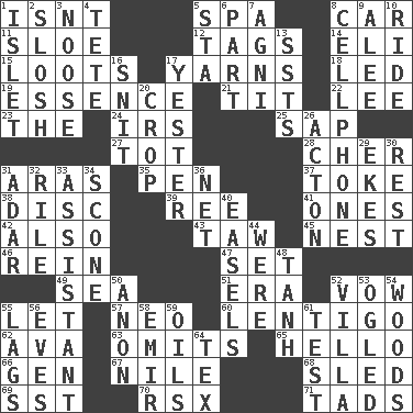 ACROSS 1. Is not 5. Health resort 8. Automobile 11. A type of plum 12. Labels 14. Connecticut Ivy Leaguer 15. Plunders 17. Entertaining tales 18. Directed 19. Core 21. Teat (slang) 22. Area sheltered from the wind 23. Definite Article 24. Big collection agency 25. Plant excrement 27. Small child 28. "Mermaids" star 31. Caspian sea tributary 35. Writing instrument 37. Casino tip 38. Compact _ 39. To sift 41. Washington bills 42. In addition 43. The 23rd letter of the Hebrew alphabet 45. Egg locale 46. It's straight from the horse's mouth 47. Arrange properly for use 49. Ocean 51. Epoch 52. Solemn pledge 55. Allow 57. Modern: prefix 60. Small, flat, pigmented spot on the skin 62. Actress Gardner 63. Leaves out 65. Phone greeting 66. Commissioned military rank (abbr.) 67. "Death on the ____" 68. Downhill vehicle 69. Fast jet (abbr.) 70. Acura sports coupe 71. Small amounts or degrees DOWN 1. Small island 2. Make a splashing sound 3. Trap for birds or small mammals 4. Wig 5. R.R. building 6. Piece 7. Hindu god of fire 8. Portable communications device 9. Toward shelter 10. Travel on an animal 13. Fast planes 16. In a ____ (agitated or irritated) 17. Next before 20. Riding implement 26. NE Massachussets city 29. Supplements with great effort 30. Respite 31. The sixth month of the Jewish calendar 32. Cause heat under the collar 33. Helper 34. Biscuitlike quick bread 36. Fish or hair follower 40. Artist's stands 44. Past tense of be (plural) 48. Hyperbolic tangent 50. Soon (poet.) 52. Country estate 53. Stared at amorously 54. Forest 55. Straggles 56. Nights before holidays 58. Arab leader 59. Petroleums 61. Trial 64. John Ritter's dad