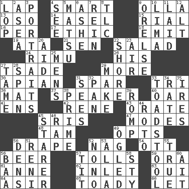 ACROSS 1. Infant locale 4. Don Adams' spy role 9. Rounded earthenware pot or jar 13. Bear (Spanish) 14. Artist's stand 15. Monetary unit of Yemen 16. For each 17. Moral principle 18. Send forth 19. _ moment's notice (2 wds.) 21. Elected rep. 22. First course 24. Tall New Zealand timber tree 26. Part of HMS, perhaps 27. Sadhe (variant) 29. Greater amount 30. Bee-related 31. Coast Guard woman 33. Three (prefix) 36. Floor covering 37. Orator 40. Rowing implement 41. Followers of ems 42. French philosopher Descartes 43. Speak pompously 45. Indian titles of respect 47. Methods 48. Scottish cap 49. Elects 50. Window treatment 52. Tired old horse 54. Baseball player Mel 56. Fermented drink made from hops 57. For Whom the Bell _____ 59. Mouth or opening 61. Queen of England 1702-14 62. An arm off of a larger body of water 63. Fr. "Yes" 64. SW Saudi Arabia district 65. Sycophant 66. Allow DOWN 1. Trim (branches) 2. At sea 3. Likenesses of persons 4. Observe 5. Taiwanese island in East China Sea 6. American tennis player Robert 7. It's straight from the horse's mouth 8. Affectionate concern, for short 9. Threatening words 10. Pale green bean 11. Put down 12. Keyboard modifier key 20. Opera by Verdi 22. Dinah or Pauly 23. Atmosphere 25. Not women's 27. Not wild 28. Connect, as a bridge 29. Cause to be 31. Perceives with the eye 32. Baking dish 33. Inedible or poisonous agaric 34. Assign a rank or rating to 35. Angers 38. First class 39. Frolic 44. Printing process, for short 45. A viewer who gazes fixedly 46. Strike 49. Stared at amorously 50. Habitations of wild animals 51. Painter Guido (1575-1642) 52. Words to Nanette 53. Silent film actress Nazimova 55. Loyal 56. Sound made by sheep 57. Teat (slang) 58. Filthy place 60. Small island
