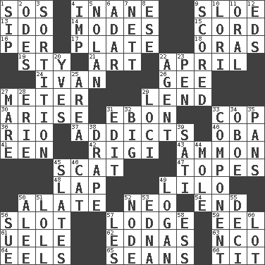 ACROSS 1. Distress signal 4. Lacking in sense or substance 9. _ gin 13. Wedding promise 14. Methods 15. Drawstring 16. For each 17. Food holder 18. Mouths or openings 19. Filthy place 21. Tate display 22. Showery time 24. "Terrible" tsar 26. Turn to the right 27. Distance measurement 29. Grant temporary use of 30. Get up 31. Inky black, to poets 33. Police officer (slang) 36. River (Sp.) 37. Inveterate users 40. Chief or king in Benin or Nigeria 41. Car or cant ending 42. Swiss mountan, "Queen of the Mountains" 43. ID or VA city 45. Go away! 47. Drinks excessively 48. Infant locale 49. _ and Stitch 50. Having winglike extensions 52. Modern: prefix 54. Conclusion 56. Position in a hierarchy or organization 57. Cabin 59. Snakelike fish 61. Ubangi River tributary 62. Ferber et al. 63. Non-commissioned officer (abbr.) 64. Snakelike fish 65. Seines 66. Teat (slang) DOWN 1. Small drink 2. Lyric poems 3. Determination 4. Mischievous child 5. Pitcher Ryan 6. The sixth month of the Jewish calendar 7. Remaining after all deductions 8. Compass dir. 9. Tallied 10. Australian parrot (variant) 11. Of the mouth 12. Begley and Asner 20. Jacques Cousteau's middle name 22. Representative 23. Writing instrument 25. Type of rug 27. Female horse 28. 4th largest of the Great Lakes 29. Locales 31. Prepare for publication 32. Large 33. Part 34. Mitch Miller's instrument 35. Zero-star reviews 38. Window treatment 39. Suttee (variant) 44. Undercover agent 45. Chalkboards 46. Feline 49. Utah city north of Ogden 50. Toward shelter 51. Hang loosely or laxly 52. Thickened enlargement 53. Pulitzer Prize-winning author Ferber 55. Tenth: prefix 56. Institute legal proceedings 57. French article 58. Double-curved letter 60. Car dealer's back yard