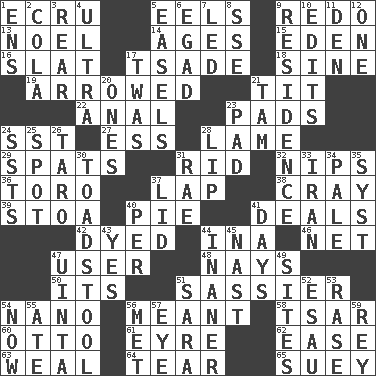 ACROSS 1. Shade of tan 5. Snakelike fish 9. Make new 13. Christmas carol 14. Matures 15. Genesis locale 16. Narrow board 17. Sadhe (variant) 18. Trig term 19. Moved like an arrow 21. Teat (slang) 22. Of or related to the anus 23. Writing tablets 24. Fast jet (abbr.) 27. Curvy letter 28. Unable to walk 29. Arguments over trivial matters 31. To free from 32. Cuts off 36. "Corrida" creature 37. Pet locale 38. Supercomputer manufacturer 39. Portico 40. Sliced dessert 41. Allots cards 42. Colored 44. _ tizzy (2 wds.) 46. Fish or hair follower 47. One who makes use of a thing 48. Negative votes 50. ___ a Wonderful Life 51. More lively and spirited 54. Billionth: prefix 56. Intended 58. Russian ruler of old 60. "Beetle Bailey" pooch 61. Jane of fiction 62. Comfort 63. Welt 64. Lacerate 65. Chop _ DOWN 1. Followers of ems 2. Root beer relative 3. Located in or toward the back 4. Extreme 5. Artist's stands 6. Mild oath 7. Directed 8. Compass dir. 9. Dwelling 10. Prepares for publication 11. Lair 12. Single 17. It was, poetically 20. Washington bills 21. Scottish cap 23. Groovy apt. 24. Fast planes 25. Blemish 26. Edible starchy tuberous root 28. Mouth edge 30. Inedible or poisonous agaric 31. Actress Charlotte 33. SW Asia republic 34. Diluted with white 35. System (abbr.) 37. Flaplike covering 40. For each 41. 24-hour periods 43. Affirmative reply 44. Sillier 45. Political cartoonist Thomas 47. National forest in Provo, Utah 49. Locates 51. "Two Mules for Sister ____" 52. Son of Isaac 53. Raze (variant) 54. At this time 55. Had dinner 56. Was introduced to 57. Sight organ 59. Marina Del _, California