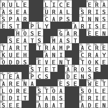 ACROSS 1. General guideline 5. Louse (plural) 9. Period 12. Toward the sea 13. Mountain range 14. Indian titles of respect 15. Practice fight 16. Smile enhancers 17. Lodging establishments 18. Eastern Standard Time (abbr.) 19. Apply oneself diligently 21. Ascend 22. Stockings 24. Slender fish 26. Car or cant ending 27. Theater features 28. Vertical spar for supporting sails 29. Small pie 30. _____ steamer (cargo ship) 32. Land measure 36. Malaysian steamed pastry 37. Black tropical American cuckoo 38. Supercomputer manufacturer 39. Probability 40. Incident 42. Puff or smoke 43. Proofreading order 44. Came up 46. Afternoon social gathering 49. Personal Computers (abbr.) 50. Cub Scout units 51. Sports stadium 53. Compass dir. 54. Dripping 57. Old wives' tales, e.g. 58. Portico 61. Flatfish 62. Prepare for publication 63. Bar bills 64. One of the Great Lakes 65. Perceive with the eye 66. Blind as ____ 67. Arabian gulf DOWN 1. To erase 2. United States Postal Service (abbr.) 3. Tough but pliablecoriaceous 4. Ewer handle 5. "I Love _" 6. Retirement account (abbr.) 7. Head covering 8. Raised railways 9. Bert's buddy 10. Remove soap 11. NE Netherlands city 14. Title for a knight 19. Pacific Standard Time (abbr.) 20. For fear that 21. Tate display 23. Expletives 24. Street urchin 25. Cleo's killer 27. Saudi Arabian king (1953-1964) 28. French painter Edouard 29. Ring climax 31. All-night dance parties 32. Gambison 33. What you're doing now 34. Immoral or dissolute person 35. Sight organ 40. And so on (abbr.) 41. Small amounts or degrees 43. Health resort 45. To sift 46. Lies 47. Wear away 48. Nest on high 52. Fish or hair follower 53. 90 degrees 55. Writer Wiesel 56. Adolescent 58. R.R. building 59. Bar bill 60. Chief or king in Benin or Nigeria 61. Ocean