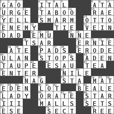 ACROSS 1. E Mali city 4. Slanted text style (abbr.) 8. "One Day ___ Time" 11. Goad 13. Off limits 15. Actress Charlotte 16. Shout 17. Excessive but superficial compliments 18. "Beetle Bailey" pooch 19. Foe 21. Neckwear 22. Distinctive style or manner 23. June honoree 24. Australian flightless bird 27. Compass dir. 29. Russian ruler of old 30. Bert's buddy 34. Had dinner 36. Writing tablets 39. Eat (away) 40. ____ Bator, Mongolia 41. Discontinues 43. Arabian gulf 44. Grayish beige 46. Son of Isaac 47. Beverage made from leaves 48. Keyboard key 49. Mediterranean tributary 51. Tired old horse 53. R.R. building 54. Floor protector 57. Paradise 60. Car dealer's back yard 63. Calif. Air Force Base 65. Kenny Rogers chart-topper in '80 66. Speak pompously 69. Play the lead 70. One more than two 71. Promenades 72. Puts into a specified state 73. Compass dir. 74. Religious group 75. Portuguese money of account (variant) DOWN 1. Ridiculed 2. Sports stadium 3. Stared at amorously 4. ___ a Wonderful Life 5. Scottish cap 6. Blind as ____ 7. Australian parrot (variant) 8. Johnson of "Laugh-In" 9. Jacques of French films 10. A really long time 12. Shade tree 14. Sign of something about to happen 18. Make much ado about nothing 20. Affirmative reply 25. Atlas contents 26. A salt of uric acid 28. Born 29. 3-inch nail 31. Connecting point 32. The content of cognition 33. Car or cant ending 34. ____ Jay Lerner 35. Tense 37. Two (Sp.) 38. Connects, as a bridge 40. Shoshoni 42. Costume for a special activity 45. Epoch 50. Experiment locale 52. Take by theft 54. Mother 55. Having winglike extensions 56. Laconic 57. Writer Wiesel 58. Raised platform 59. Singer Brickell 61. Mouths or openings 62. Story 64. Double-curved letter 67. Affectionate concern, for short 68. Eastern Standard Time (abbr.)