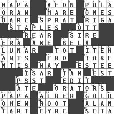 ACROSS 1. California wine valley 5. Age 9. Monetary unit of Botswana 13. NW Algerian seaport 14. Female horse 15. Singles 16. Have the gumption 17. Small fatty European fish 18. Capital of Latvia 19. Paper fasteners 21. Baseball player Mel 22. Tail end 23. Beget 24. Epoch 27. Deep reverence 28. Actor Lugosi 29. Type of eclipse 31. Small child 32. A distinct part 36. Pismires 37. Away 38. Puff or smoke 39. Nuclear Threat Initiatives 40. Can I? 41. First name in cosmetics 42. Austrian river, tributary to the Danube 44. Scottish cap 46. Eastern Standard Time (abbr.) 47. Inconspicuous attention getter 48. Prepare for publication 50. Had dinner 51. Speakers 54. Dad 56. Tree or shrub in the Birch family 58. Gilded 60. Sign of things to come 61. Carrot, for example 62. ____ Jay Lerner 63. Small pie 64. Jane of fiction 65. Stalk of a moss capsule DOWN 1. Allow head to fall sleepily 2. Caspian sea tributary 3. Role in a play 4. Approach 5. Electrical Unit 6. Hearing organs 7. Mouth or opening 8. Fish or hair follower 9. Likenesses of persons 10. Join together 11. Part of a journey 12. White ___ sheet 17. Cole _ (cabbage dish) 20. Lightbulb-shaped fruit 21. Petroleum 23. Put into a specified state 24. Flair 25. Undersized animal 26. Against 28. Surprise greeting 30. Aide 31. Attempt 33. Carryall 34. Supplements with great effort 35. Rendezvous 37. At a great distance 40. Floor protector 41. Give off 43. Compass dir. 44. Cigar-shaped 45. The sixth month of the Jewish calendar 47. Some stationery 49. Ancient Roman robes 51. Scent 52. Hero or heavy, e.g. 53. Narrow board 54. Plant holder 55. Wet nurse (var.) 56. "We ___ not amused" (Victoria) 57. Myrna of the movies 59. Heredity factor (abbr.)