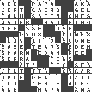 ACROSS 1. Adept person 4. Dad 8. Alias (abbr.) 11. Certainty 13. Capital of Egypt 15. Set 16. Hyperbolic tangent 17. Smooth fabric 18. Singles 19. Flexible twig of a willow tree 21. Possessed 22. Fine (Spanish) 23. Born 24. Compass dir. 27. Order of Saint Francis (abbr.) 29. The longest river in Central Asia 30. Pig sounds 34. 54 in ancient Rome 36. "Tell ____ the Marines!" 39. Biscuitlike quick bread 40. Relaxation 41. Lacerates 43. Locale of original sin 44. Excessive but superficial compliments 46. Dutch treat 47. To riddle 48. Spanish missionary in California 49. Canisters 51. _ moment's notice (2 wds.) 53. And so on (abbr.) 54. Ocean 57. Penny 60. ___ a Wonderful Life 63. Motion picture award 65. Mitch Miller's instrument 66. Started a card game 69. Jacques of French films 70. Car dealer's back yard 71. Nest on high 72. Actor Baldwin 73. One (Scot) 74. California wine valley 75. Santa ___, CA DOWN 1. 13-14th century defensive garment 2. Stop 3. Bert's buddy 4. Personal Computers (abbr.) 5. American Automobile Association (abbr.) 6. Heart or essence 7. Operatic vocal solo 8. Hindu god of fire 9. Peachy ____! 10. In addition 12. Definite Article 14. Southwest Nigerian state 18. Persons of authority 20. Acura sports coupe 25. Set or collection 26. First name in cosmetics 28. Mayday 29. Make much ado about nothing 31. Thickened enlargement 32. Leg joint 33. Elected rep. 34. Unable to walk 35. Austrian river, tributary to the Danube 37. Small boy 38. Speak pompously 40. Curvy letter 42. Stricken, poetically 45. Floor covering 50. Non-commissioned officer (abbr.) 52. Opera by Verdi 54. Any of the three canals of the cochlea 55. Ingested 56. N. Chile seaport 57. Root beer relative 58. Inky black, to poets 59. Brief written record 61. Adolescent 62. "Two Mules for Sister ____" 64. R.R. building 67. Mouth edge 68. Beverage made from leaves