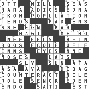ACROSS 1. Baseball player Mel 4. Place where flour is made 8. Oceans 12. Hindu Mythology: god of death 14. Goodbye (Sp.) 16. Pulitzer Prize-winning author Ferber 17. Picture 18. Census information 20. Looks after 22. Writing tablet 23. Followers of ems 24. Compass dir. 25. Age 28. Long, evenly shaped piece 30. Wise men 31. Paris' subway 35. Born 37. Snakelike fish 40. It's straight from the horse's mouth 41. Expressions of contempt or scorn 42. Learning spot: Fr. 44. Ubangi River tributary 45. Taverns 46. Snake ____ (dice throw) 47. Compass dir. 48. Olfactory organs 50. Raised platform 52. Secret 54. Player for Phoenix 55. _ moment's notice (2 wds.) 58. White ___ sheet 61. Actress Gardner 63. Debunk (Brit. slang) 65. Frustrate 70. The longest river in the world 71. Hero or heavy, e.g. 72. Sir (Sp.) 73. Locale of original sin 74. Inside; within (prefix) 75. Suttee (variant) 76. Eastern Standard Time (abbr.) DOWN 1. Leaves out 2. Proceeds 3. Heavy duty weighing machine 4. Atlas unit 5. Wedding promise 6. Mouth edge 7. Central Nebraska county 8. Arrange properly for use 9. Singer Brickell 10. At once, immediately (arch.) 11. Without 13. Added to 15. Thick slice 19. First of billions? 21. Ocean 26. Double curve, resembling the letter S 27. Sibling's daughter 29. Summer TV shows 30. Makes clutter 32. Adolescent 33. Cause heat under the collar 34. Single 35. Words to Nanette 36. Immeasurably long periods of time 38. Myrna of the movies 39. Bobsleighs 41. Storage container 43. He sold his birthright 49. Narrow board 51. Working for oneself (abbr.) 53. Jacques Cousteau's middle name 55. Stay 56. Falsehoods 57. Rep 58. 1/640 square mile 59. Within a short period 60. Old (Scot.) 62. Ancient Greek god of war 64. Compass dir. 66. Modern: prefix 67. Santa ___, CA 68. Small bed 69. Three (prefix)