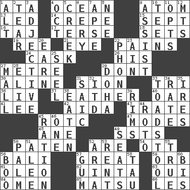 ACROSS 1. "One Day ___ Time" 4. Sea 9. Smallest unit of an element 13. Directed 14. Streamer paper 15. Back-to-school mo. 16. _ Mahal 17. Laconic 18. Arranges properly for use 19. Portuguese money of account (variant) 21. Sight organ 22. Aches 24. Keg 26. Part of HMS, perhaps 27. Distance measurement (Brit.) 29. Do not 30. Place in a line 31. The Jewish people; Israel 33. Three (prefix) 36. 54 in ancient Rome 37. Cordwainer's material 40. Boat paddle 41. Area sheltered from the wind 42. Opera by Verdi 43. Feeling or showing extreme anger 45. College mil. group 47. Methods 48. One (Scot) 49. Fast planes 50. Eucharist need 52. "We ___ not amused" (Victoria) 54. Baseball player Mel 56. Indonesian resort city 57. Relatively large 59. Globe 61. Margarine 62. National forest in Provo, Utah 63. Fr. "Yes" 64. Sign of something about to happen 65. Taiwanese island in East China Sea 66. French article DOWN 1. Keyboard modifier key 2. Pull apart 3. Descriptive word 4. Sep. follower 5. Small stream 6. Suggestive of the supernatural 7. Domed church section 8. Born 9. Aid 10. Adolescent 11. Elects 12. Mountains (abbr.) 20. Merit 22. Give a jingle 23. The 18th letter of the Arabic alphabet 25. Stitch closed the eyes of (a falcon) 27. Promenade 28. Writer Wiesel 29. Capital of the state of Qatar 31. Ketch in the Levant 32. It would 33. Inedible or poisonous agaric 34. Pace 35. Angers 38. Eroded 39. Basketball hoops 44. Printing process, for short 45. Food allowance for one day 46. Single 49. Theater features 50. Inside of hand 51. Toward shelter 52. Roberta Peters solo 53. Monthly bill 55. Loyal 56. Surprise greeting 57. Chewing product 58. The 19th letter of the Greek alphabet 60. Altar cloth linen