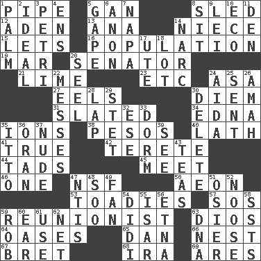 ACROSS 1. Corncob 5. Separate the seeds from cotton 8. Downhill vehicle 12. Arabian gulf 13. Santa ___, CA 14. Sibling's daughter 15. Allows 16. Census information 19. Make imperfect 20. Legislator 21. Welles in "The Third Man" 23. And so on (abbr.) 24. White ___ sheet 27. Snakelike fish 30. South Vietnam president (1954) 31. Scheduled 34. Pulitzer Prize-winning author Ferber 35. Charged particles 38. Mexican monetary units 40. Thin strip of wood or metal 41. Loyal 42. Cylindrical with tapered ends 44. Bits 45. Confront 46. Single 47. Science/research agcy. 50. Age 53. Sycophants 57. Mayday 59. One who advocates reunion 63. "Vaya con ____" 64. Fertile tracts in a desert 65. Daniel's nick name 66. Egg locale 67. Cy Young winner Saberhagen 68. Retirement account (abbr.) 69. Ancient Greek god of war DOWN 1. Inside of hand 2. Perfect 3. _ dish (used to culture cells) 4. Followers of ems 5. Open wide 6. At once, immediately (arch.) 7. California wine valley 8. Be seated 9. Flowery wreath 10. Environmental prefix 11. Lair 14. Drug cop 17. Shoshoni 18. Car dealer's back yard 20. Stitch closed the eyes of (a falcon) 22. Makes clutter 24. Opera by Verdi 25. Transmitted 26. Wet nurse 28. Pet locale 29. Proofreading order 30. Erase 32. Compass dir. 33. Dormintory (informal) 35. "Tell ____ the Marines!" 36. NW Algerian seaport 37. Naked 39. Perceive with the eye 43. Afternoon social gatherings 47. Nuclear Threat Initiatives 48. "Barney Miller" actor Jack 49. Air blower 51. Flexible twig of a willow tree 52. Trap for birds or small mammals 54. "You Light Up My Life" star Conn 55. Austrian river, tributary to the Danube 56. Inactive volcano in Sicily 58. Fast planes 59. Director Reiner 60. Hearing organ 61. Purpose 62. Fish or hair follower 63. Heredity factor (abbr.)