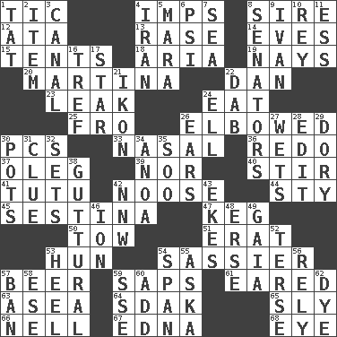 ACROSS 1. Nervous spasm 4. Naughty children 8. The founder of a family 12. _ moment's notice (2 wds.) 13. To erase 14. Nights before holidays 15. Portable shelters 18. Operatic vocal solo 19. Negative votes 20. Chrissie's court nemesis 22. One of the 12 tribes of Israel 23. Path through which fluid escapes 24. Consume 25. From 26. Shoved, as through a crowd 30. Personal Computers (abbr.) 33. Relating to the nose 36. Make new 37. Cassini of fashion 39. And not 40. Tumult 41. Ballerina skirt 42. Trap for birds or small mammals 44. Filthy place 45. French poetic form 47. Cask 50. Pull behind 51. Part of Q.E.F. 53. Attila the _ 54. More lively and spirited 57. Fermented drink made from hops 59. Plant excrements 61. Having ears or earlike features 63. At sea 64. Neighbor of Neb. 65. Secret 66. 1994 drama film starring Jodie Foster 67. Pulitzer Prize-winning author Ferber 68. Sight organ DOWN 1. Make lace 2. A whole individual unit 3. Lessep's creation 4. SW Asia republic 5. Hindu Mythology: god of death 6. Air pressure measure (abbr.) 7. Ocean 8. Elected representatives 9. _ the terrible 10. Marina Del _, California 11. Curvy letter 16. Unclean, religiously 17. Play the lead 21. Picture 22. Small moist lump or mass 24. Pipe bend 26. Hearing organs 27. Soaks 28. Prepare for publication 29. Small, narrow, flatbottom fishing boat 30. Plant holders 31. A slight indication 32. Puts into a specified state 34. Small Philippine buffalo 35. "Barney Miller" actor Jack 38. From the throat 42. Compass dir. 43. Supplements with great effort 46. Electrically charged atom 48. Celtic language 49. Greek goddess of the earth (variant) 52. Laconic 53. The bottom of a shoe or boot 54. Connect, as a bridge 55. "____ silly question..." 56. Trust 57. Bar 58. Compass dir. 59. Compass dir. 60. Say or write further 62. Color