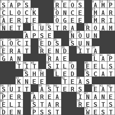 ACROSS 1. Plant excrements 5. Vintage cars 9. Electrical Unit 12. Timepiece 14. Single time 15. Third mo. 16. Nest on high 17. Double curve, resembling the letter S 18. Medical imaging device (abbr.) 19. Fish or hair follower 20. A period of five years 23. Wander aimlessly 24. Domed church section 25. Part of speech 27. Locales 30. Begley and Asner 32. Player for Phoenix 33. Part of Q.E.F. 34. Tear apart 36. Call ___ day 38. Separate the seeds from cotton 39. Actress Charlotte 40. Infant locale 43. Teat (slang) 46. Grain storage tower 48. Snakelike fish 49. Quiet! 51. Directed 52. Scram! 53. Leg joint 54. Beverages made from leaves 56. Set or collection 58. Michaelmas daisies 61. Ingest 64. For each 65. Type of rug 66. Empty; void 68. Biblical high priest 69. Play the lead 70. Musical pauses 71. Lair 72. Inconspicuous attention getter 73. Compass direction DOWN 1. Examine minutely or intensely 2. Toward shelter 3. Sweet dark-red dessert wine 4. _-fi 5. Carrot, for example 6. Engineer (abbr.) 7. Seas 8. Observe 9. ID or VA city 10. Hindu Mythology: god of death 11. Demure 13. Seaweed 21. One who makes use of a thing 22. Spring feasts 23. Undersized animal 24. Small island 26. Fr. "Yes" 27. Part of a journey 28. Mouth or opening 29. Patter 31. Slow-paced one 35. Keyboard key 37. Actor Baldwin 41. Wing 42. Pacific Standard Time (abbr.) 44. Is not 45. Definite Article 47. Baltic tributary 48. Double-curved letter 50. Centers of feelings and intuitions 53. Japanese brewing company 55. SW Saudi Arabia district 56. Broke a traffic law 57. Ubangi River tributary 59. Oceans 60. Small pie 61. Comfort 62. Pismires 63. Trial 65. Cleo's killer 67. ___ Haven, CT