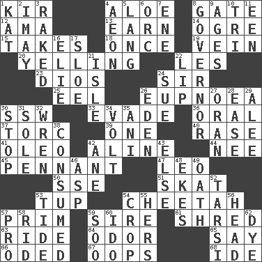 ACROSS 1. Apertif with cassis 4. _ vera 8. Yard entry 12. Wet nurse (var.) 13. Merit 14. Legendary monster 15. Proceeds 18. Single time 19. Distinctive style or manner 20. Crying or shouting loudly 22. French article 23. "Vaya con ____" 24. Title for a knight 25. Snakelike fish 26. Normal relaxed breathing 30. Compass dir. 33. Dodge 36. Taken by mouth 37. Torque (variant) 39. Single 40. Raze (variant) 41. Margarine 42. Place in a line 44. Born 45. Pre-World Series prize 47. Lion 50. Compass dir. 51. Three-handed card game 53. Uncastrated adult male sheep 54. Leopard's kin 57. Demure 59. The founder of a family 61. Tear up 63. Travel on or in a vehicle 64. Scent 65. Declare 66. Wrote a lyric poem 67. I made a mistake 68. Binary compound DOWN 1. Krazy ___ of comics 2. "If ____ say so..." 3. Swept the length of 4. Period of immesurable duration 5. Austrian-born American filmmaker Fritz 6. The grampus (Milton) 7. Compass dir. 8. State head 9. Matures 10. Three (prefix) 11. Car or cant ending 16. Writer Wiesel 17. A type of plum 21. Small island 22. Mouth edge 24. Institute legal proceedings 26. Paradise 27. Northwest Algerian city 28. Comfort 29. Toward shelter 30. Discontinue 31. Flatfish 32. Songbird 34. Electrical Unit 35. Cuckoo 38. Ingested 42. One (Scot) 43. Otherwise 46. Cleo's killer 48. Supplements with great effort 49. Pledge 52. Tarsus (plural) 53. Event that recurs at intervals 54. Riding implement 55. Possessive pronoun 56. Froth on beer 57. Adept person 58. To free from 59. "Barney Miller" actor Jack 60. Wedding promise 62. Color