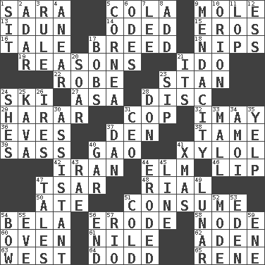 ACROSS 1. "Two Mules for Sister ____" 5. Root beer relative 9. Undercover agent 13. Goddess of spring and wife of Bragi 14. Wrote a lyric poem 15. Greek god of love 16. Story 17. A special lineage 18. Cuts off 19. Thinks logically 21. Wedding promise 22. Loose flowing garment 23. Comedian Laurel of Laurel & Hardy 24. What Jean-Claude Killy likes to do 27. White ___ sheet 28. Flat circle 29. Ethiopian city, capital of Harari 31. Police officer (slang) 32. "If ____ say so..." 36. Nights before holidays 37. Lair 38. Docile 39. Backtalk 40. E Mali city 41. Xylene (variant) 42. SW Asia republic 44. Shade tree 46. Mouth edge 47. Russian ruler of old 48. Monetary unit of Yemen 50. Had dinner 51. Eat 54. Actor Lugosi 56. Wear away 58. Connecting point 60. Baking chamber 61. "Death on the ____" 62. An important port of Yemen 63. 270 degrees 64. Texas town _ City 65. French philosopher Descartes DOWN 1. Be seated 2. The sixth month of the Jewish calendar 3. Governing power 4. Approach 5. Pupil covering 6. Lyric poems 7. Area sheltered from the wind 8. Find the sum of 9. Ananias' fault 10. Constellation of myth 11. Trim (branches) 12. Curvy letter 17. Moves up and down 20. Fly high 21. It is 23. Small drink 24. "______ My Girl" (Turtles hit) 25. Polynesian shrub of the pepper family 26. Angers 28. Spanish title 30. Aide 31. Corporate head (abbr.) 33. Promenade 34. Mine, in Marseilles 35. Sharp bark 37. One of the 12 tribes of Israel 40. Slender fish 41. Dec. holiday 43. Actress Charlotte 44. Eaten away 45. Actor's bit 47. Stories 49. Type of eclipse 51. Having a low temperature 52. Method 53. Locale of original sin 54. Arrow shooter 55. Night before a holiday 56. Conclusion 57. _ de Janeiro 59. Compass dir.