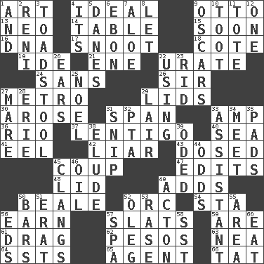ACROSS 1. Tate display 4. Standard of perfection 9. "Beetle Bailey" pooch 13. Modern: prefix 14. Eating place 15. Within a short period 16. Heredity factor (abbr.) 17. Snout, nose 18. ____ d'Azur (French Riviera) 19. Binary compound 21. Compass dir. 22. A salt of uric acid 24. Without 26. Title for a knight 27. Paris' subway 29. Flaplike coverings 30. Came up 31. Connect, as a bridge 33. Electrical Unit 36. _ de Janeiro 37. Small, flat, pigmented spot on the skin 40. Ocean 41. Snakelike fish 42. One who doesn't tell the truth 43. Administered medicine 45. Overturn; upset 47. Proofreads 48. Hat (slang) 49. Does sums 50. Calif. Air Force Base 52. The grampus (Milton) 54. R.R. building 56. Merit 57. Narrow boards 59. "We ___ not amused" (Victoria) 61. To trail on the ground 62. Mexican monetary units 63. Teachers' org. 64. Fast planes 65. Representative 66. Make lace DOWN 1. Also 2. Painter Guido (1575-1642) 3. Inedible or poisonous agaric 4. ___ a Wonderful Life 5. Natives or inhabitants of Denmark 6. Inky black, to poets 7. Medicinal plant 8. Allow 9. Motion picture awards 10. A blast of a horn 11. Haul 12. Single 20. Hearing organs 22. Putting into practice 23. To free from 25. Christmas carol 27. Female horse 28. 4th largest of the Great Lakes 29. Den 31. Sever or remove by pinching or nipping 32. Parent Teacher Association (abbr.) 33. Helper 34. Confront 35. Writing tablets 38. Evade 39. Wrote a lyric poem 44. Likelihood 45. Rigngs loudly 46. Petroleum 49. NE Massachussets city 50. Drinking establishments 51. Part of Q.E.F. 52. Cassini of fashion 53. To erase 55. Length times width 56. Begley and Asner 57. Health resort 58. Fast jet (abbr.) 60. Consume