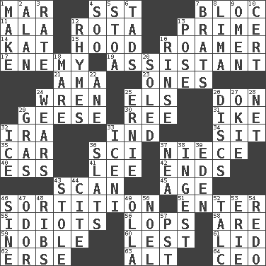 ACROSS 1. Impair 4. Fast jet (abbr.) 7. Coalition 11. According to 12. Round or rotation of duties 13. A-one 14. Krazy ___ of comics 15. Parka part 16. Wanderer 17. Foe 19. Aide 21. Housemaid (var.) 23. Singles 24. Songbird 25. Raised railways 26. Spanish title 29. Honkers 30. Portuguese money of account (variant) 31. Mamie's husband 32. Lyricist Gershwin 33. Indiana (abbr.) 34. Be seated 35. Automobile 36. _-fi 37. Sibling's daughter 40. Double-curved letter 41. Area sheltered from the wind 42. Conclusions 43. Skim 45. Grow older 46. Drawing lots 51. Keyboard key 55. Foolish or stupid persons 56. Chops off 58. "We ___ not amused" (Victoria) 59. Having high moral qualities 60. For fear that 61. Hat (slang) 62. Celtic language 63. The first octave above the treble staff 64. Corporate head (abbr.) DOWN 1. Create 2. ____ Jay Lerner 3. Pace 4. "Barney Miller" actor Jack 5. Portico 6. Small boys 7. Naughty children 8. Pale green bean 9. Sign of things to come 10. Foregone conclusion 12. Poems 13. Introduce or present, as a question 16. Wash lightly 18. Female horse 20. Having a sole or soles 22. A saturated hydrocarbon 24. Puts on (as clothing) 25. Bert's buddy 26. Flat circles 27. Migrant worker of the '30s 28. Fish or hair follower 29. Pate de foie ____ 32. Frozen water 33. Ancient Celtic tribe of eastern Britain 36. Narrow boards 37. Teachers' org. 38. Consume 39. Locale of original sin 43. Took without asking 44. Quote 46. Trig term 47. Aroma 48. Teases 49. Rounded earthenware pot or jar 50. Christmas carol 52. Baby powder 53. One of the Great Lakes 54. Redecorate 57. Pacific Standard Time (abbr.)