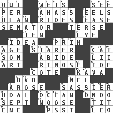ACROSS 1. Fr. "Yes" 4. Soaks 8. Perceive with the eye 11. For each 12. Collect or gather 14. Snakelike fish 15. ____ Bator, Mongolia 17. Amusement-park features 18. Comfort 19. Legislator 21. Laconic 23. Nine, plus one 24. Potassium hydroxide 25. The main thing one is thinking about 27. Demure 30. Ripen 31. A viewer who gazes fixedly 34. Feline 37. Boy, to dad 38. Tolerate 39. Cards in a Roman deck? 40. Tate display 41. Full of chinks, cracks, or crevices 43. Binary compound 44. ____ d'Azur (French Riviera) 45. Polynesian shrub of the pepper family 47. Movie disc 49. Cartoonist voice _ Blanc 50. Came up 52. More disrespectful 56. Freehold land 57. Sea 60. Southwest Nigerian state 61. Back-to-school mo. 62. Trap for birds or small mammals 63. Teat (slang) 64. Compass dir. 65. Inconspicuous attention getter 66. Lion DOWN 1. Musical composition 2. Ubangi River tributary 3. SW Asia republic 4. Make _____ (do battle with) 5. Arab leader 6. Small amount or degree 7. Compass dir. 8. Gospel singer Marvin 9. Otherwise 10. Compass dir. 13. Fast jet (abbr.) 14. Suggestive of the supernatural 16. Nathan's nickname 20. Beverages made from leaves 22. Shade tree 25. Russian composer Stravinsky 26. Gouge 27. A-one 28. Make new 29. Angers 30. White ___ sheet 32. Edible starchy tuberous root 33. "This won't hurt ____!" 34. 154 in Roman numerals 35. Opera by Verdi 36. Make a knot 42. Supplements with great effort 44. Music discs 46. In addition 47. Window treatment 48. Electrical Unit 49. French painter Edouard 50. An important port of Yemen 51. A really long time 52. Backtalk 53. International (abbr.) 54. Singer Brickell 55. Printing process, for short 56. Purpose 58. Police officer (slang) 59. Greek goddess of the dawn