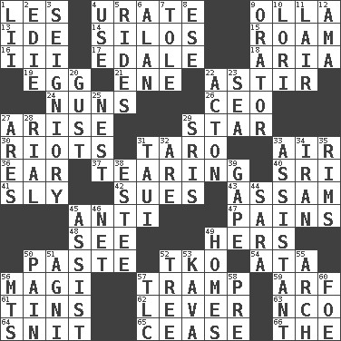 ACROSS 1. French article 4. A salt of uric acid 9. Rounded earthenware pot or jar 13. Binary compound 14. Grain storage towers 15. Wander aimlessly 16. One more than two 17. Peak District village in England 18. Roberta Peters solo 19. Oval reproductive body of a fowl 21. Compass dir. 22. Moving about 24. Religious women 26. Corporate head (abbr.) 27. Get up 29. Play the lead 30. Disturbances 31. Edible starchy tuberous root 33. Wind 36. Ewer handle 37. Pulling into pieces 40. _ Lanka 41. Insidious 42. Takes to court 43. Indian state 45. Opposed to 47. Aches 48. Perceive with the eye 49. Possessive pronoun 50. Thick mixture 52. Ring climax 54. _ moment's notice (2 wds.) 56. Wise men 57. _____ steamer (cargo ship) 59. Sandy's bark 61. Metal containers 62. Prying instrument 63. Non-commissioned officer (abbr.) 64. In a ____ (agitated or irritated) 65. Desist 66. Definite Article DOWN 1. Cards in a Roman deck? 2. Singer Brickell 3. Signiory (variant) 4. Purpose 5. Amusement-park features 6. Actor Alda or Thicke 7. Lacquered or enameled metalware 8. Compass dir. 9. Speaker 10. Australian parrot (variant) 11. Den 12. Wet nurse (var.) 20. Abrupt rush of wind 22. Gambison 23. Ocean 25. A home for chicks 27. Ancient Greek god of war 28. Monetary unit of Yemen 29. Indian titles of respect 31. "Change" in Tahitian 32. "We ___ not amused" (Victoria) 33. Aide 34. SW Asia republic 35. Basketball hoops 38. First name in cosmetics 39. Open wide 44. "Two Mules for Sister ____" 45. Help 46. Fish or hair follower 49. Residences 50. Ache 51. Hindu god of fire 52. Woody plant 53. Polynesian shrub of the pepper family 55. Bowlike part 56. Mountains (abbr.) 57. Affectionate concern, for short 58. Before (prefix) 60. Enemy
