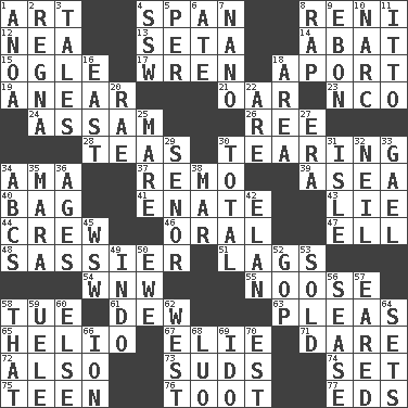 ACROSS 1. Tate display 4. Connect, as a bridge 8. Painter Guido (1575-1642) 12. Teachers' org. 13. Bristle 14. Blind as ____ 15. Stare at amorously 17. Songbird 18. To the left, to Queeg 19. Approach 21. Rowing implement 23. Non-commissioned officer (abbr.) 24. Indian state 26. To separate or throw off 28. Beverages made from leaves 30. Lacerating 34. Housemaid (var.) 37. San ____ (Riviera town) 39. At sea 40. Paper or plastic container 41. Related on the mother's side 43. Falsehood 44. Group working together 46. Of the mouth 47. Pipe bend 48. More lively and spirited 51. Falls behind 54. Compass dir. 55. Trap for birds or small mammals 58. Third day of the wk. 61. Morning condensation 63. Entreaties 65. Sun: prefix 67. Writer Wiesel 71. Have the gumption 72. In addition 73. Soap bubbles 74. Arrange properly for use 75. Adolescent 76. A blast of a horn 77. Begley and Asner DOWN 1. Small Philippine buffalo 2. Canadian anthropologist Darnell 3. Lies 4. Compass dir. 5. For each 6. Had dinner 7. Billionth: prefix 8. Strike 9. Inky black, to poets 10. Drug cop 11. "Tell ____ the Marines!" 16. Compass direction 18. Type of rug 20. Actress Charlotte 22. "We ___ not amused" (Victoria) 25. Female horse 27. Epoch 29. Sir (Sp.) 30. "_____ Recall" 31. Small island 32. Famous astronaut Armstrong 33. Highlander 34. Lettered men learn these first 35. Hindu Mythology: god of death 36. Matures 38. Third mo. 42. Flair 45. Compass dir. 49. Southeast Asian peninsula 50. She-sheep 52. Grand Old Party 53. Exchanged or delivered for money 56. Gospel singer Marvin 57. Having ears or earlike features 58. Not this but _ 59. Ubangi River tributary 60. Otherwise 62. Compass direction 64. Puts into a specified state 66. Electrically charged atom 68. Nilotic language 69. Wedding promise 70. Eastern Standard Time (abbr.)