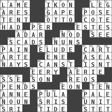 ACROSS 1. Unable to walk 5. Image 9. Part of a journey 12. Ancient Greek god of war 13. Stare wonderingly 14. Introduce or present, as a question 15. Portable shelter 16. "Beetle Bailey" pooch 17. ____ d'Azur (French Riviera) 18. Possessed 19. For each 21. _____ Park, CO 22. The sixth month of the Jewish calendar 24. Allow head to fall sleepily 26. Observe 27. Heaps 28. Religious women 29. Ache 30. Evade 32. Heavy open wagon 36. Johnson of "Laugh-In" 37. Compass dir. 38. At sea 39. Negative votes 40. 2nd pers. sing. pres. of can (arch.) 42. Is not 43. Suggestive of the supernatural 44. Nest on high 46. Compass dir. 49. Male child 50. Vintage cars 51. Depends 53. Age 54. "___ Little Indians" 57. Queen of England 1702-14 58. Monetary unit of Botswana 61. Diluted with white 62. Part of speech 63. Indian titles of respect 64. A single undivided whole 65. Indian title of respect (Mr.) 66. Event that recurs at intervals 67. Proofreading order DOWN 1. Thin strip of wood or metal 2. Type of rug 3. Ananias' fault 4. Eastern Standard Time (abbr.) 5. Composer Stravinsky 6. Krazy ___ of comics 7. Elect 8. Modern: prefix 9. Plunders 10. First name in cosmetics 11. Honkers 14. Personal Computers (abbr.) 19. Groovy apt. 20. Celtic language 21. Begley and Asner 23. Natives or inhabitants of Denmark 24. Unclothed pictures 25. Single 27. "Two Mules for Sister ____" 28. Pet term 29. Baking dish 31. Memorize 32. Capital of Egypt 33. Aide 34. French philosopher Descartes 35. Make lace 40. Corporate head (abbr.) 41. Pacific island yam 43. Curvy letter 45. Car or cant ending 46. Connects, as a bridge 47. Sir (Sp.) 48. World-weariness 52. Lair 53. Comfort 55. Writer Wiesel 56. Remaining after all deductions 58. Pacific Standard Time (abbr.) 59. RI univ. 60. Hat (slang) 61. Purulenc