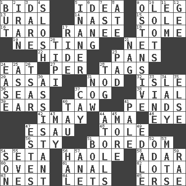 ACROSS 1. Auction offers 5. It may be bright or harebrained 9. Cassini of fashion 13. Mountain range 14. Political cartoonist Thomas 15. Flatfish 16. Pacific island yam 17. The wife of a rajah (variant) 18. Heavy book 19. Inhabiting a nest 21. Fish or hair follower 22. Flintstone garb 23. Zero-star reviews 24. Ingest 27. For each 28. Labels 29. Slender Brazilian palm 31. Lower and raise head in agreement 32. Capri or Wright 36. Oceans 37. Gear tooth 38. Small bottle 39. Hearing organs 40. The 23rd letter of the Hebrew alphabet 41. Hangs 42. "If ____ say so..." 44. Housemaid (var.) 46. Sight organ 47. He sold his birthright 48. Lacquered or enameled metalware 50. Filthy place 51. Mood resulting from idleness 54. Stalk of a moss capsule 56. White Person, in Hawaii 58. The sixth month of the Jewish calendar 60. Baking chamber 61. Of or related to the anus 62. Globular water bottle used in Asia 63. Egg locale 64. Allows 65. Celtic language DOWN 1. Yet 2. SW Asia republic 3. Have the gumption 4. Make a splashing sound 5. More empty; more void 6. Mild oath, euphamism for damn 7. Compass dir. 8. Had dinner 9. Clearly or manifestly demonstrative 10. Plunders 11. Shade tree 12. Turn to the right 17. Travel on an animal 20. Native american tent (variation) 21. Tired old horse 23. Groovy apt. 24. Relaxation 25. Toward the sea 26. Russian ruler of old 28. Coat; cloak 30. Aide 31. Immediately 33. Trig term 34. Kenny Rogers chart-topper in '80 35. Otherwise 37. Island 40. The 19th letter of the Greek alphabet 41. Light colored 43. Can I? 44. Ringlike coral islands and reefs 45. Greater amount 47. _____ Park, CO 49. Peak District village in England 51. Water vessel 52. Scent 53. Floor protectors 54. Boy, to dad 55. Night before a holiday 56. Actor Linden 57. One (Scot) 59. Actress Charlotte