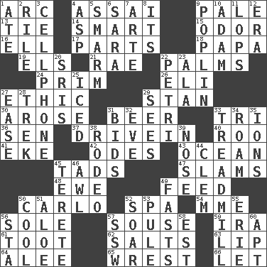 ACROSS 1. Curve 4. Slender Brazilian palm 9. Light colored 13. Make a knot 14. Don Adams' spy role 15. Aroma 16. Pipe bend 17. Components 18. Dad 19. Raised railways 21. Actress Charlotte 22. Insides of hands 24. Demure 26. Biblical high priest 27. Value system 29. Comedian Laurel of Laurel & Hardy 30. Came up 31. Fermented drink made from hops 33. Three (prefix) 36. Elected rep. 37. Popular '50s hangout 40. Friend of Pooh 41. Supplement with great effort 42. Lyric poems 43. Sea 45. Small boys 47. Shuts with force 48. She-sheep 49. Nourish 50. Monte _, Las Vegas Hotel/Casino 52. Health resort 54. Madame (abbr.) 56. Flatfish 57. Boozer 59. Lyricist Gershwin 61. A blast of a horn 62. Table seasonings 63. Mouth edge 64. Toward shelter 65. Obtain by seizing forcibly or violently 66. Allow DOWN 1. Had dinner 2. Cause heat under the collar 3. Portable communications device 4. Cleo's killer 5. Excessive but superficial compliments 6. "Two Mules for Sister ____" 7. Johnson of "Laugh-In" 8. It is 9. Cotton for raincoats, e.g. 10. First of billions? 11. Chops off 12. Period 20. Indian titles of respect 22. _ dish (used to culture cells) 23. In the manner of 25. On the rocks 27. Relaxation 28. Long journey 29. Perceives with the eye 31. Auction offers 32. First lady 33. Excercise machine 34. Wander aimlessly 35. Charged particles 38. Cowboy competition 39. Sense of smell 44. To starve (Brit.) 45. Cigar-shaped 46. Leather borer 49. Goes without food and/or water 50. Calm and collected 51. Medicinal plant 52. Fly high 53. Whimper 55. 4th largest of the Great Lakes 56. R.R. building 57. Compass dir. 58. Eastern Standard Time (abbr.) 60. Fitting